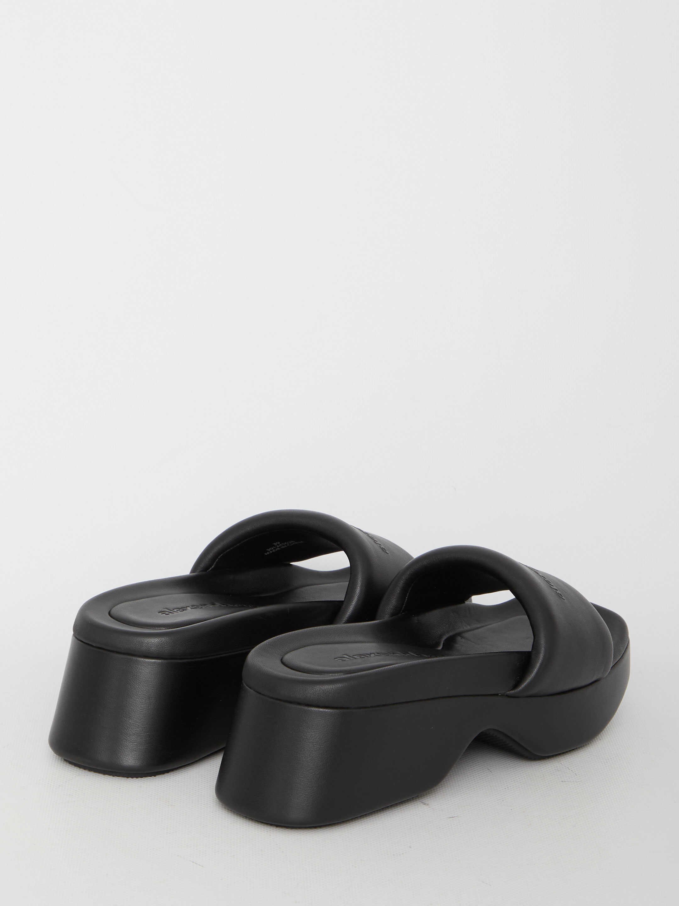 Float slides in black leather with Alexander Wang logo and platform. Rubber sole.