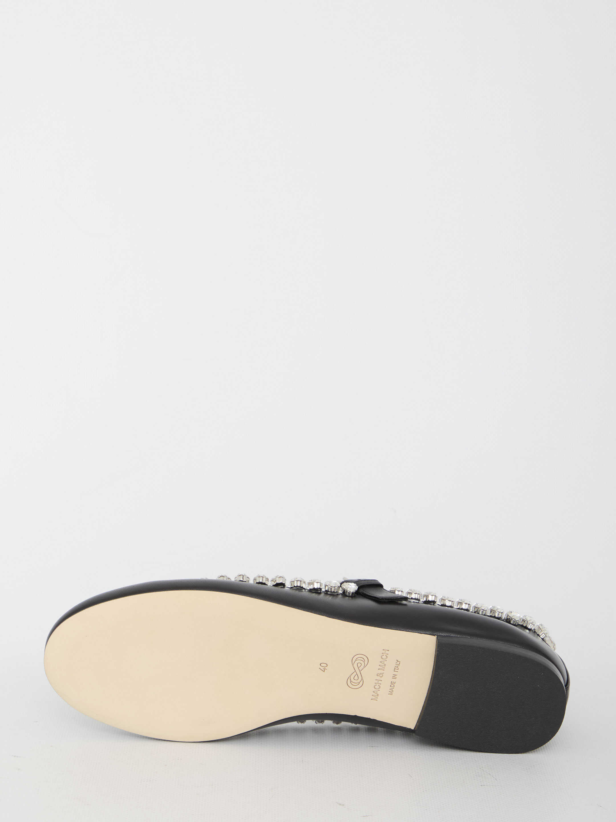 Audrey ballerinas in black leather with heart-shaped crystals. They feature round toe, adjustable strap and leather sole.