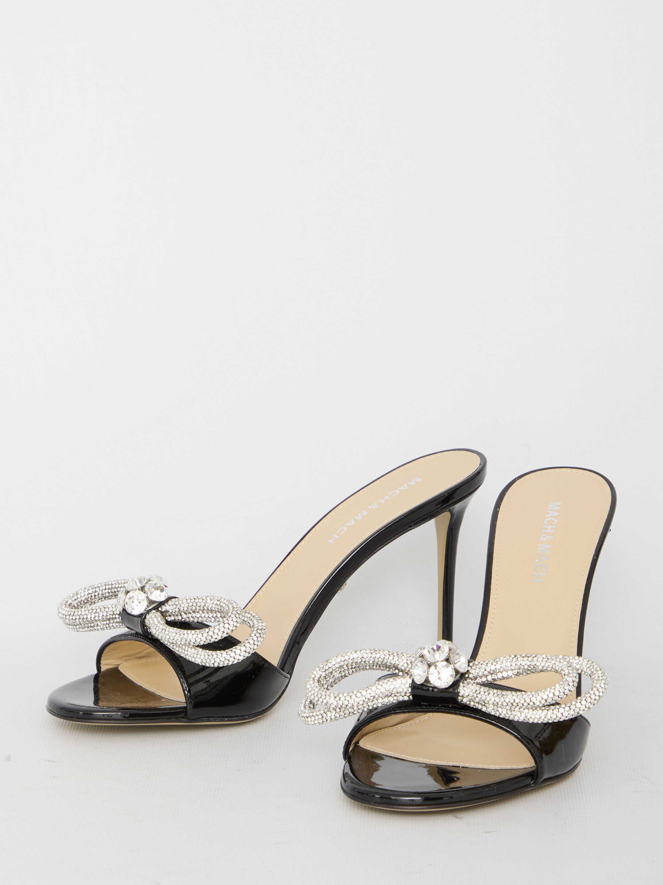 Double Bow mules in black patent leather with crystal double bow detail. Round toe, thin heel and leather sole.