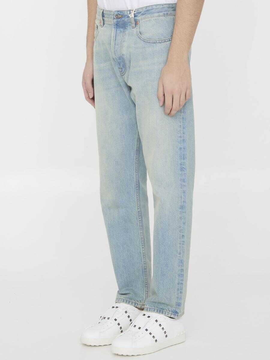 Valentino jeans in denim with embossed VLogo Signature at rear pocket. It features button closure, five-pocket design, VLogo Signature label in leather at the back and belt loops. Chino fit.