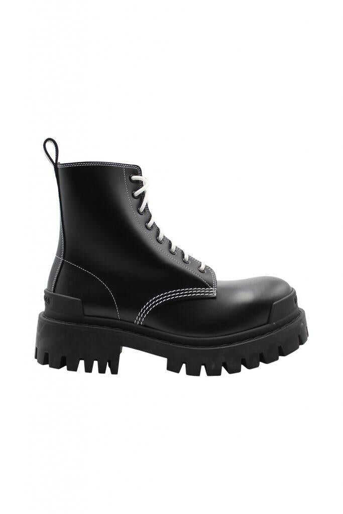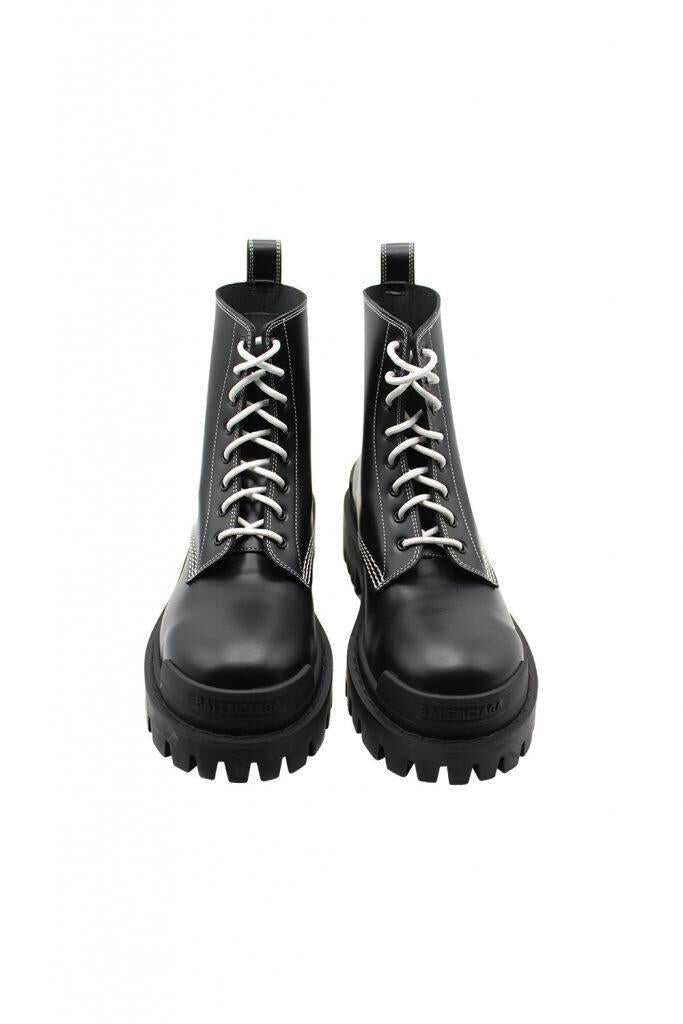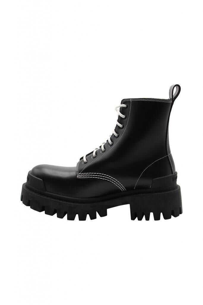Strike Lace-up Boots in black smooth calfskin featuring Extra round toe, 20mm arch, white Visible top stitching, Balenciaga logo in the front and in the back of the sole