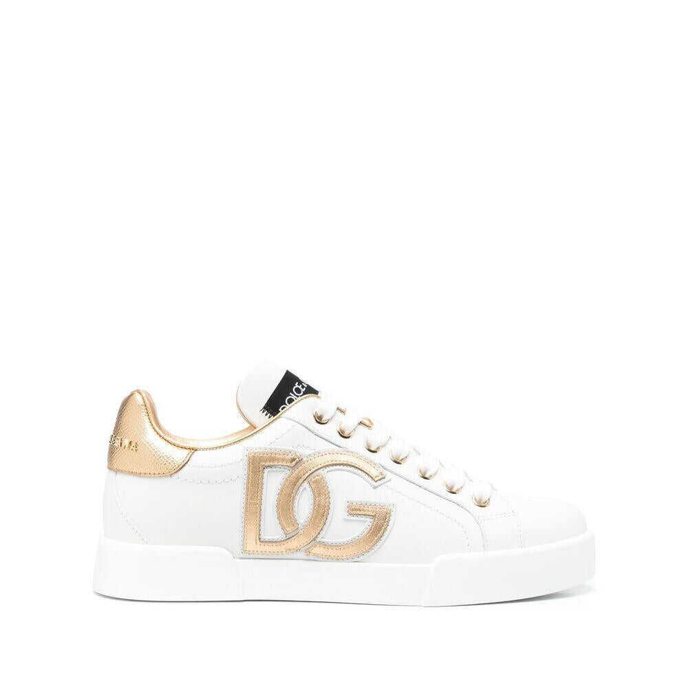 Dg-embellished low-top sneakers from dolce & gabbana featuring chalk white, calf leather, logo-embellished side panels, logo patch at the tongue, metallic heel counter, front lace-up fastening, round toe, branded leather insole and flat rubber sole.