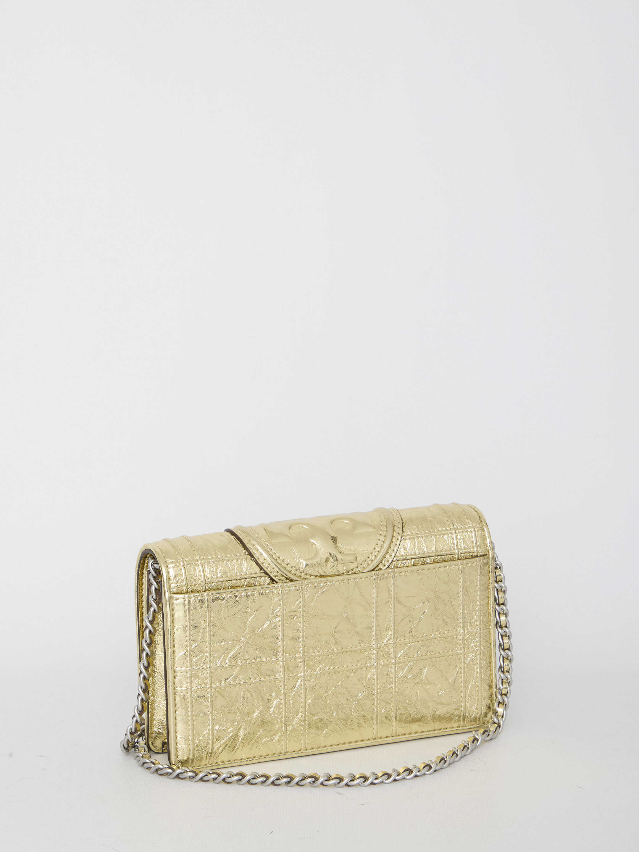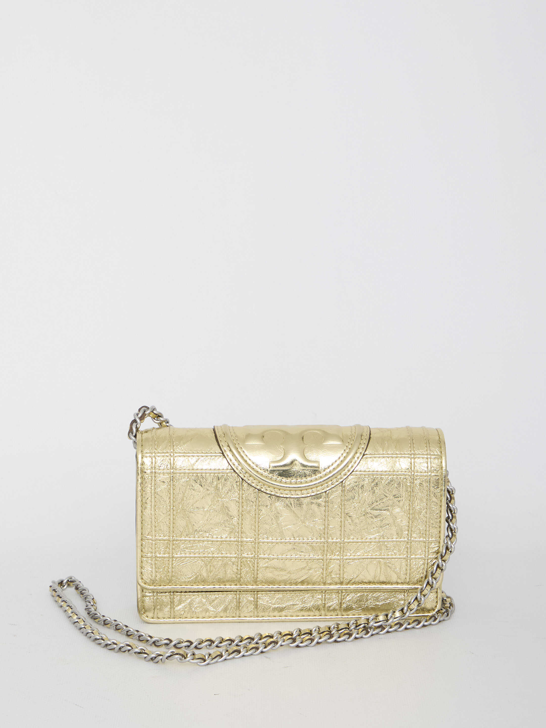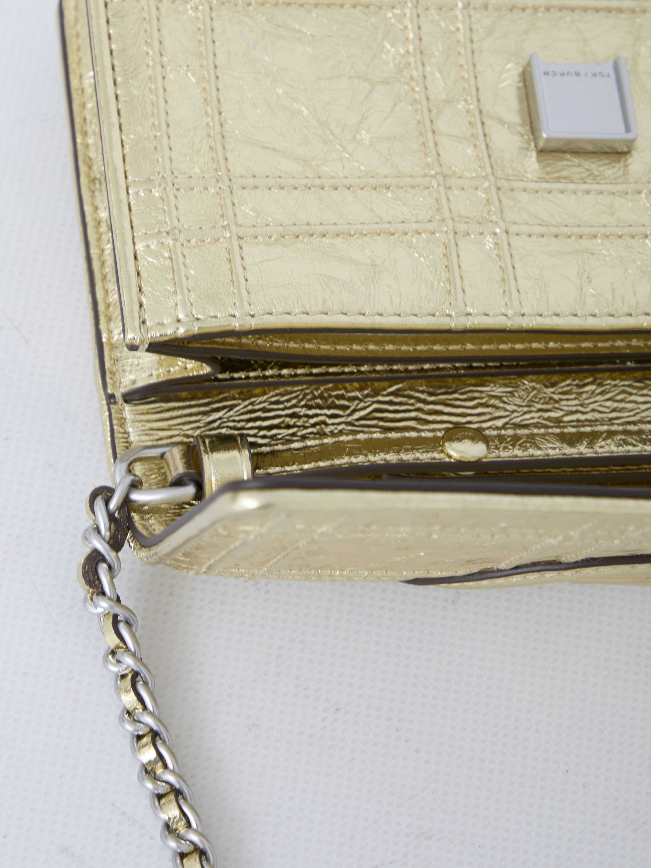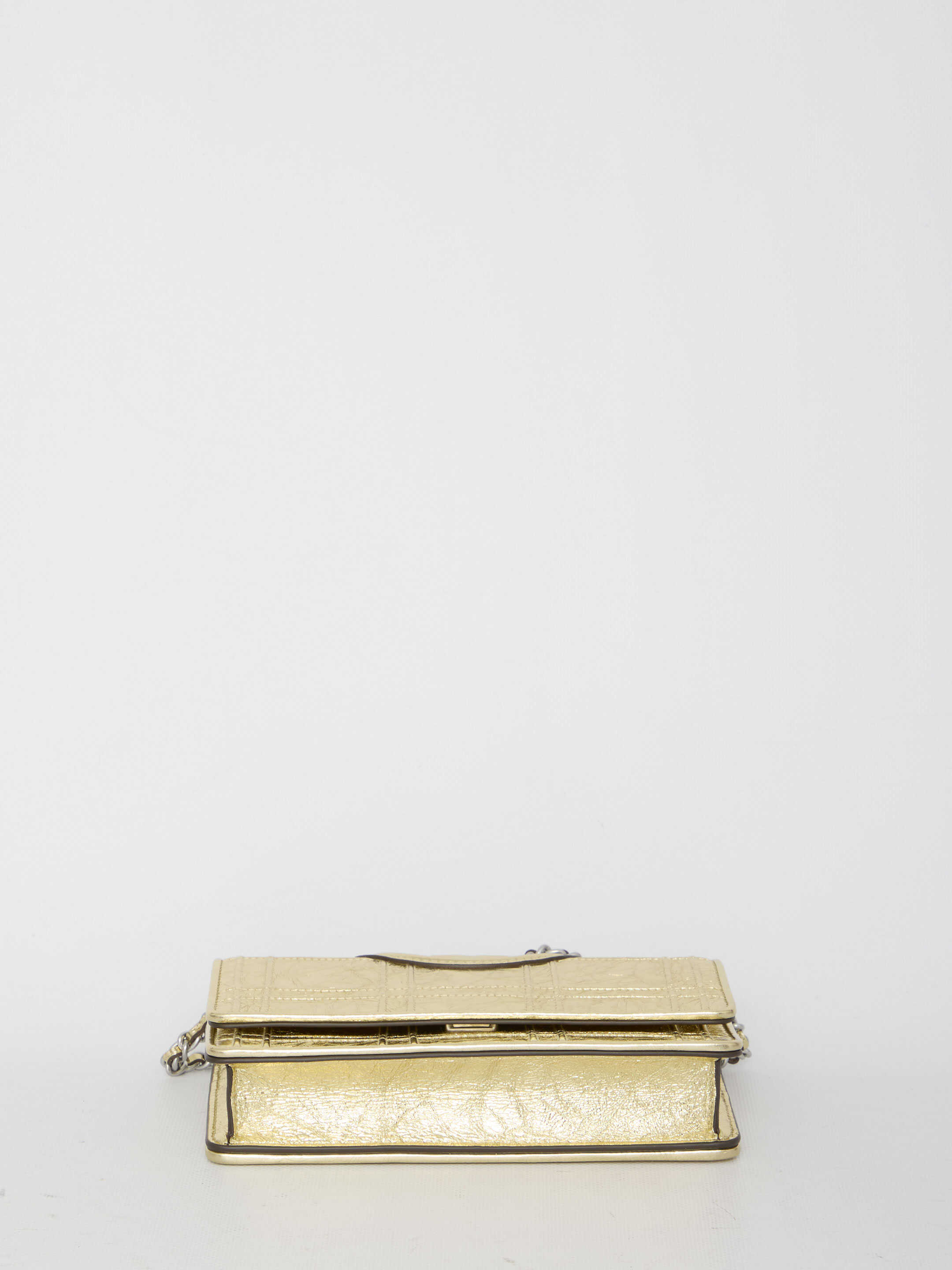 Fleming Soft Metallic Square Quilt Chain Wallet bag in gold-tone metallic leather with embossed Double T logo on top. It features chain shoulder strap, magnetic closure, one main interior compartment, one interior zip pocket, two interior flat pockets and six interior card slots. One rear flat pocket.