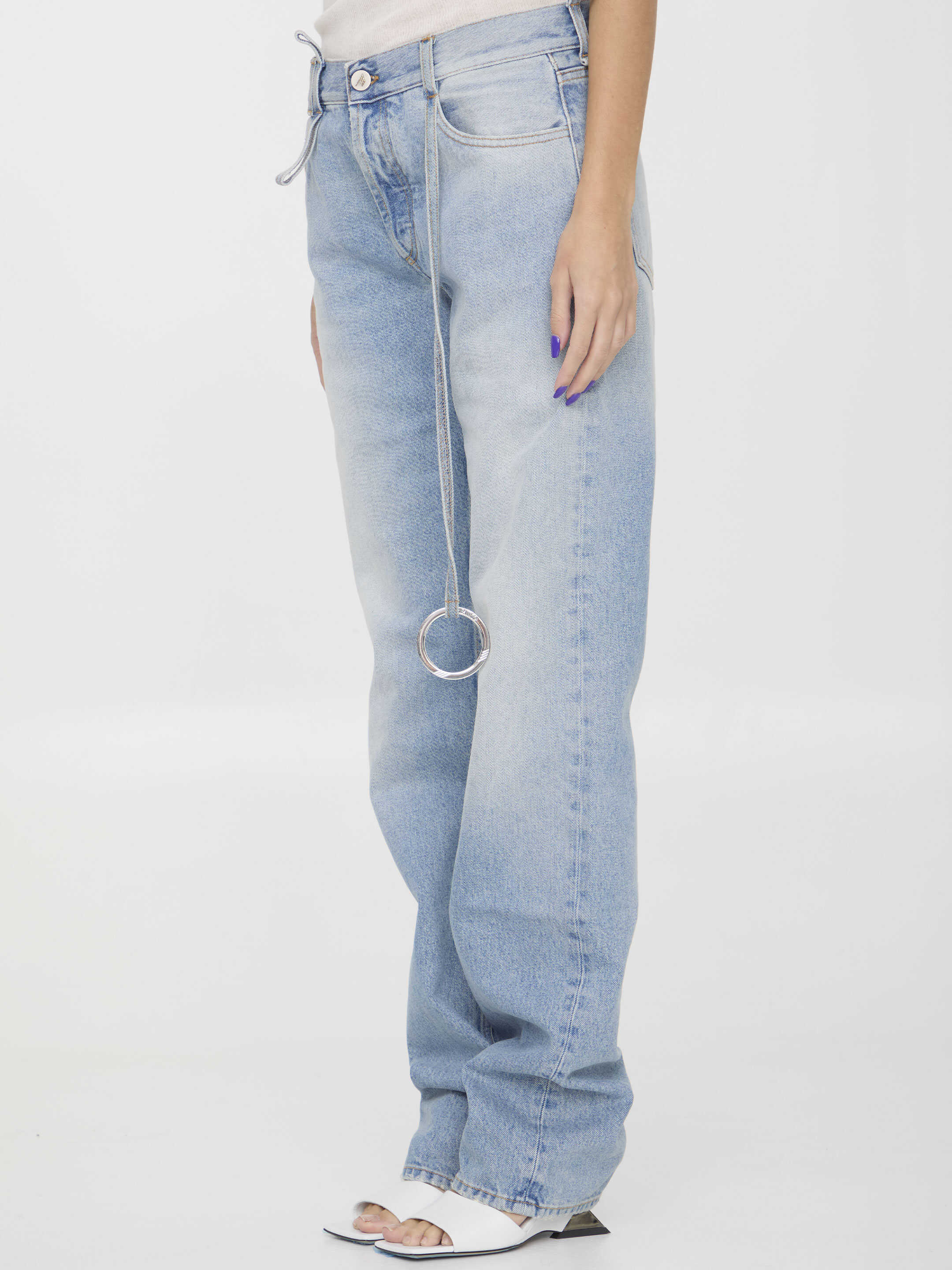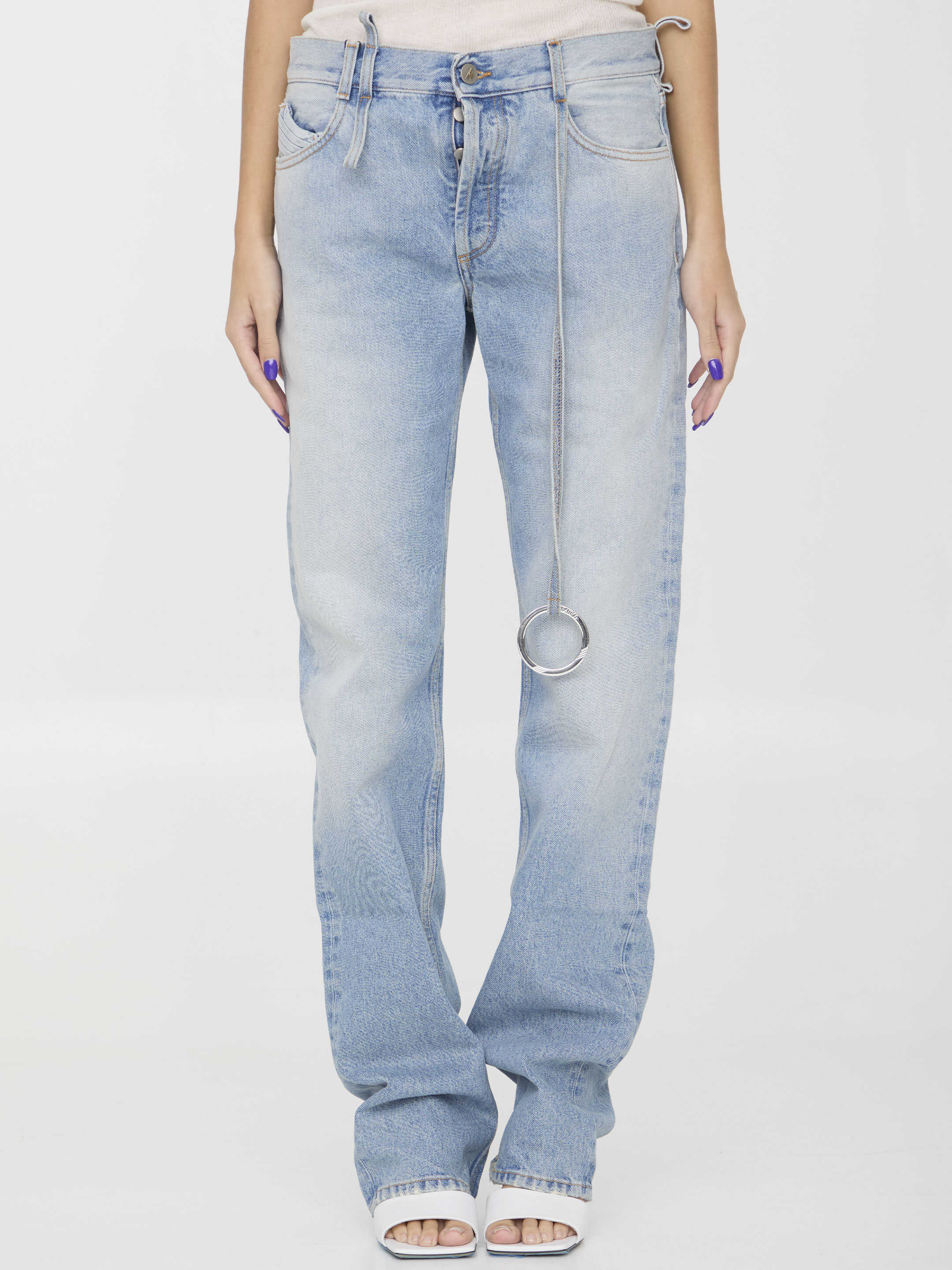 Jeans in washed light-blue cotton denim. It features button closure, five-pocket design, pendant detail with ring, tabs detailing, belt loops and The Attico logo embroidered at the back. Regular fit.