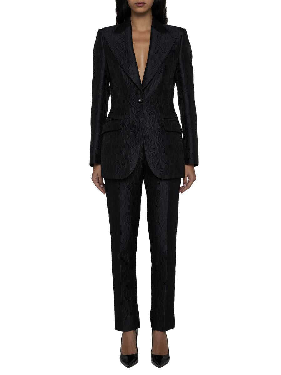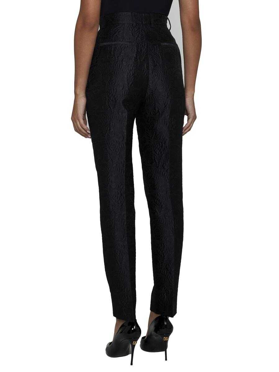Dolce & Gabbana’s black cotton and silk blend brocade slim-fit trousers featuring high waist, belt loops, button-logo and zip fly, side pockets, back welt pockets and ironed crease.