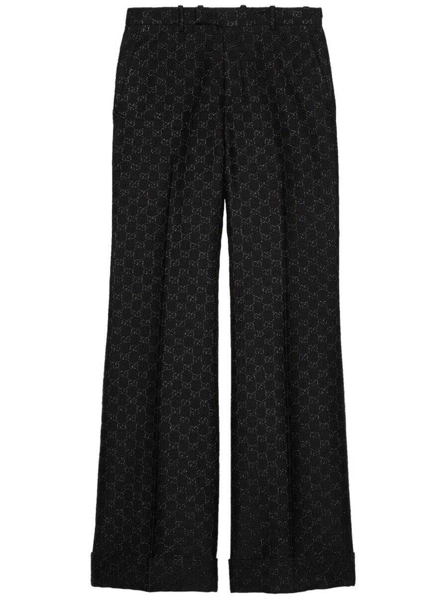 black wool lamé effect signature GG Supreme embroidery concealed front fastening belt loops pressed crease turn-up hem two rear jetted pockets LENGTH: 140.0 Centimetres WIDTH: 140.0 Centimetres