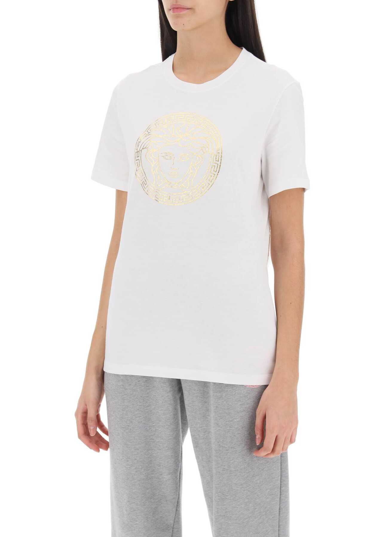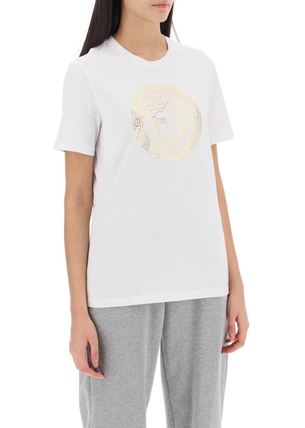 Versace T-shirt crafted in pure cotton jersey with metallic Medusa print on the chest. It features micro-ribbed crew neck. Regular fit. The model is 177 cm tall and wears size IT 38.