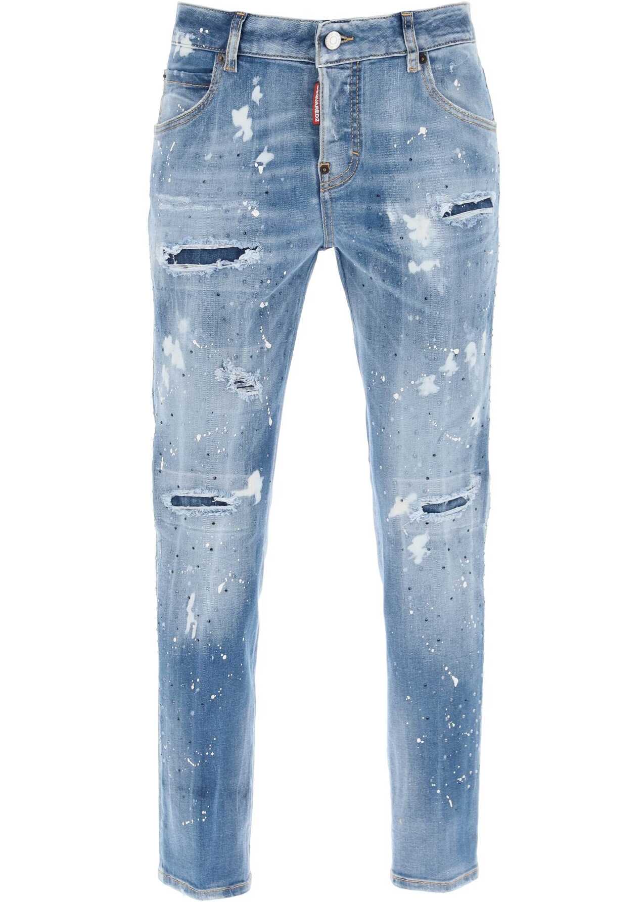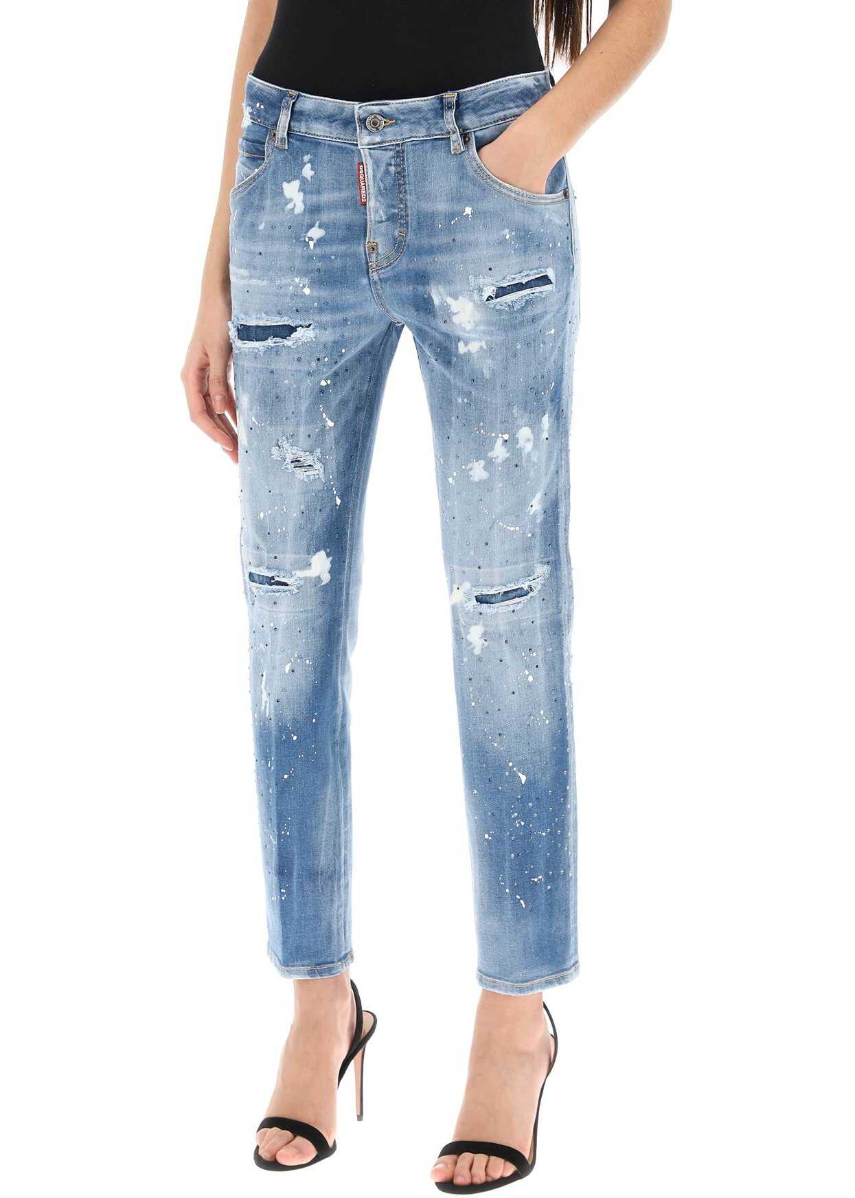 Dsquared2 jeans crafted in stretch cotton denim with Medium Ice Spots Wash characterized by paint splatter and distressed detailing, enriched by rhinestones all over. Five-pocket design featuring hidden button closure, belt loops and logoed leather jacron on the back of the waist. Cool Girl silm fit. The model is 177 cm tall and wears size IT 38.