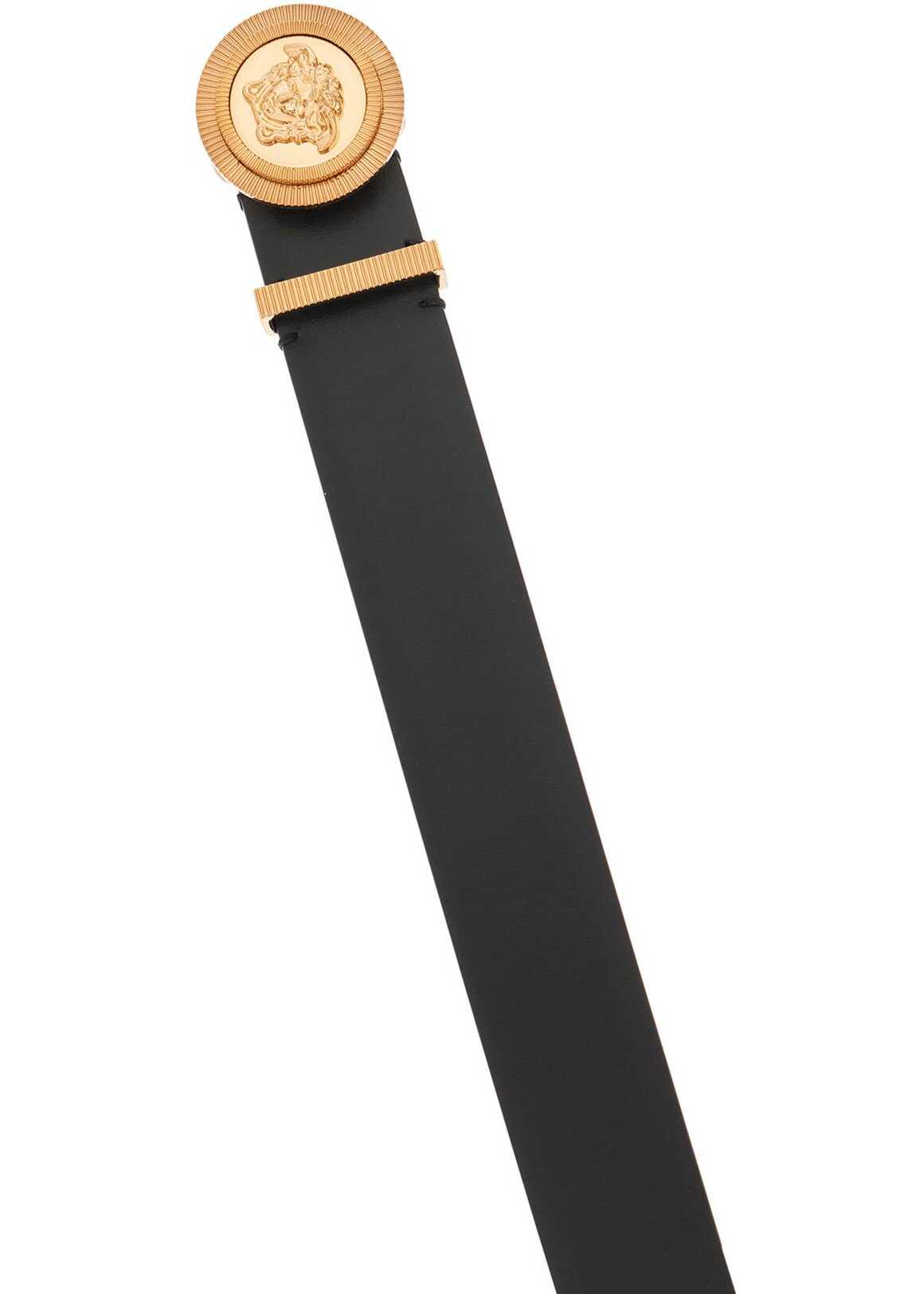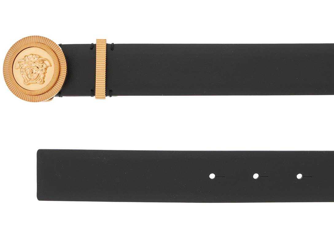 Versace leather belt with gold-tone metal Medusa Biggie buckle and a matching loop. Adjustable pin closure. The item in photo is size 100.