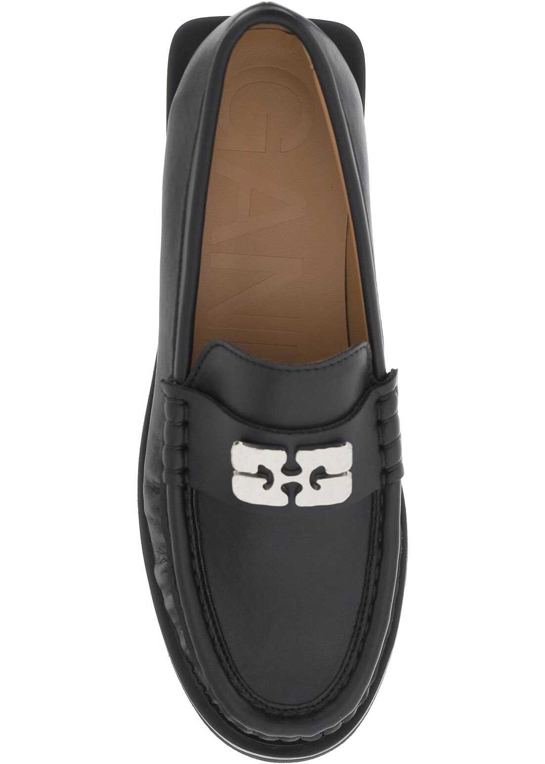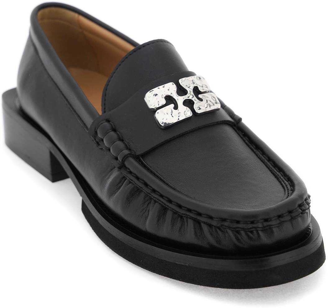Ganni moccasins made of faux leather with silver metal Butterfly logo applied on the penny bar. Faux leather footbed and rubber sole.