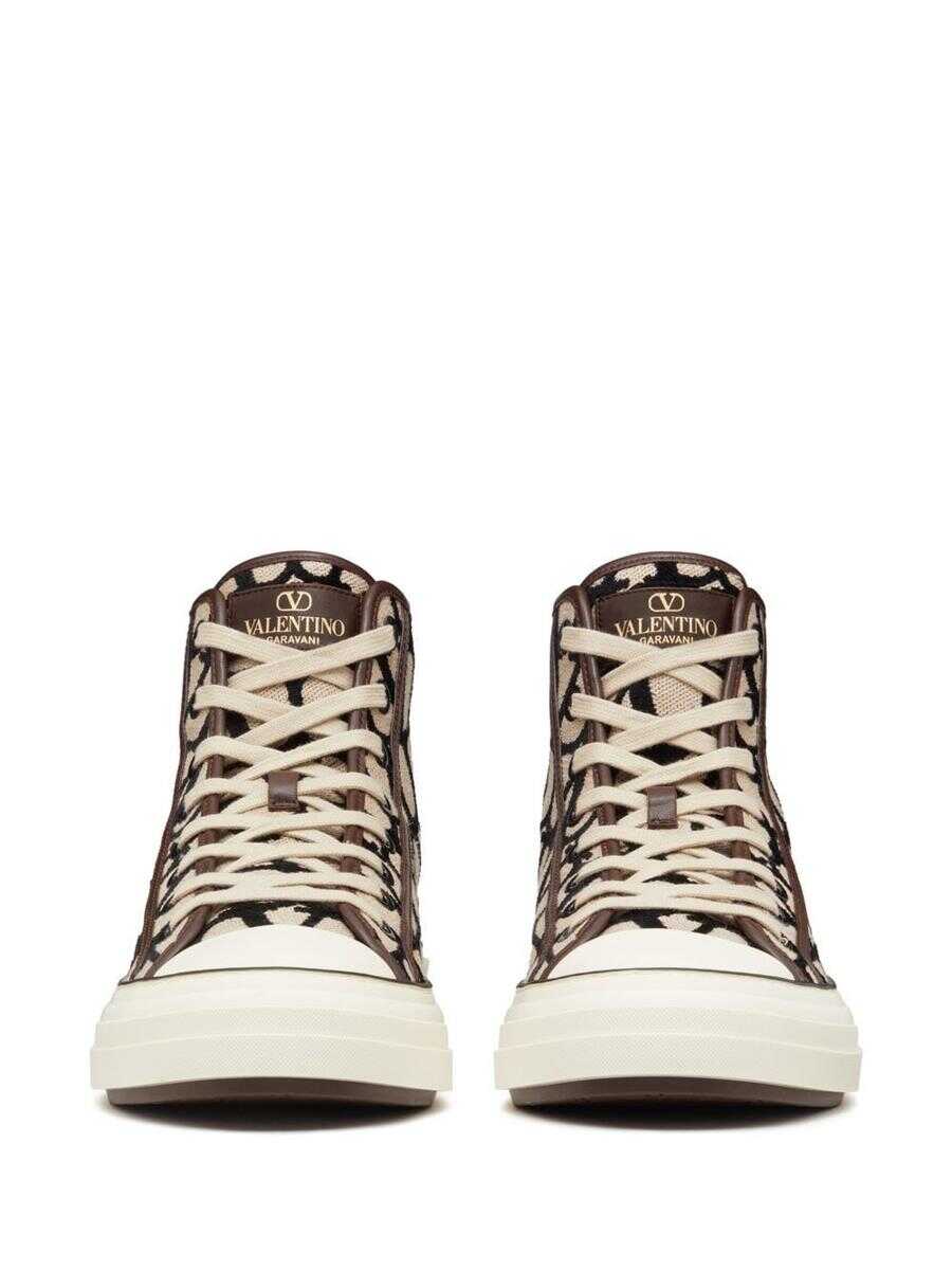 Tootaloop logo-print hi-top sneakers from VALENTINO GARAVANI featuring beige, brown, cotton, all-over logo print, logo patch at the tongue, round toe, front lace-up fastening and flat rubber sole.