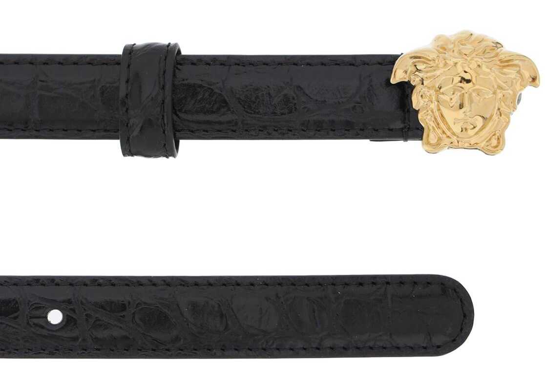 Versace croco-embossed leather belt enriched by gold-finished metal La Medusa buckle. The pictured item is a size 90.