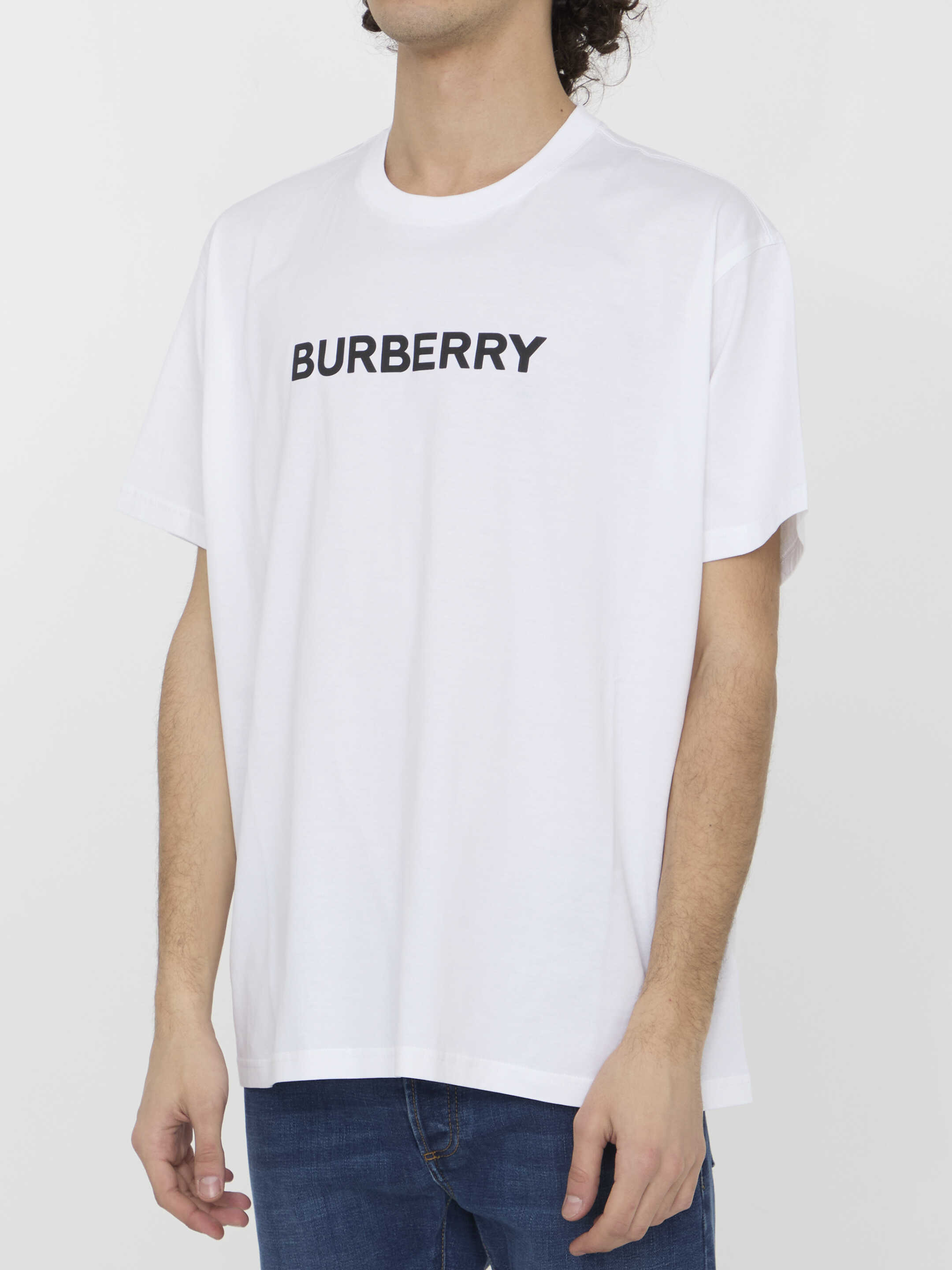 Short-sleeved crewneck t-shirt in white cotton with Burberry logo printed on the front. Regular fit.