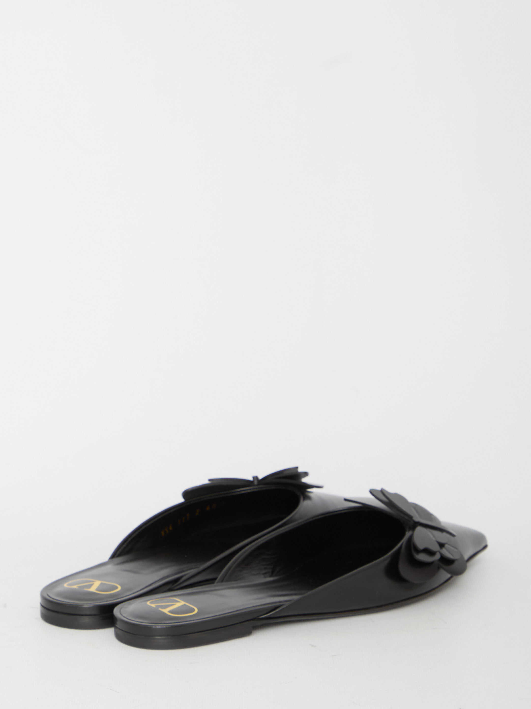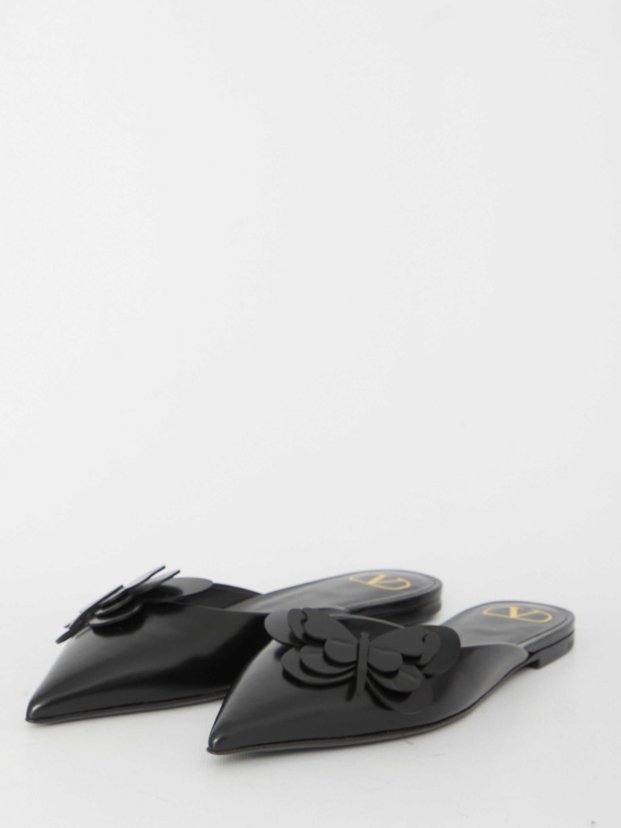 Valentino Garavani flat mules in black leather with pointed design and butterfly appliqué.