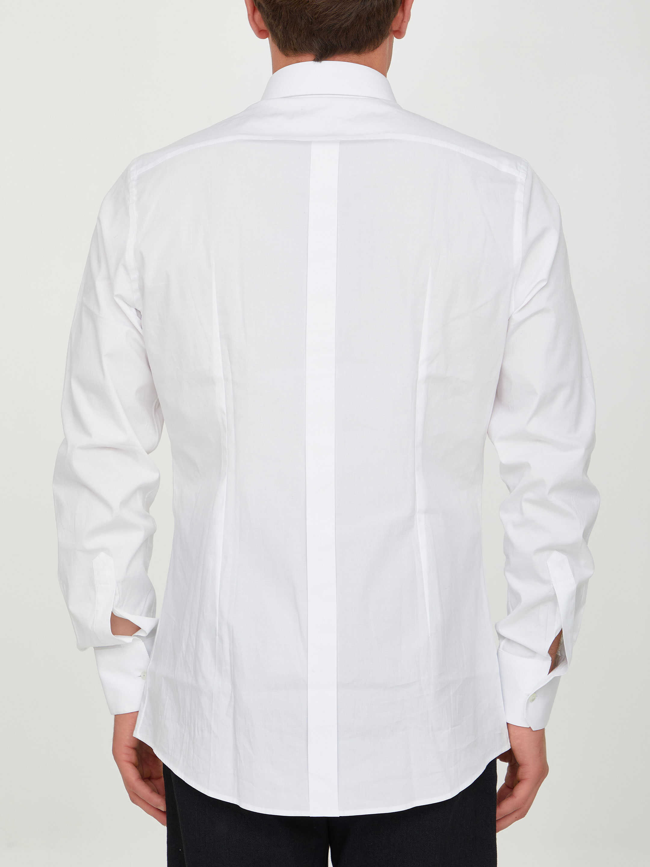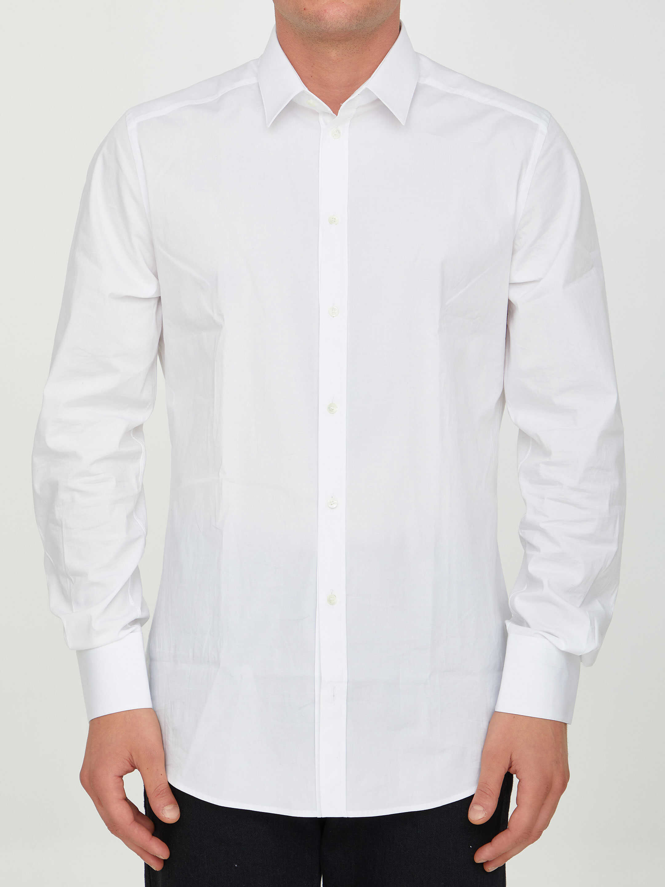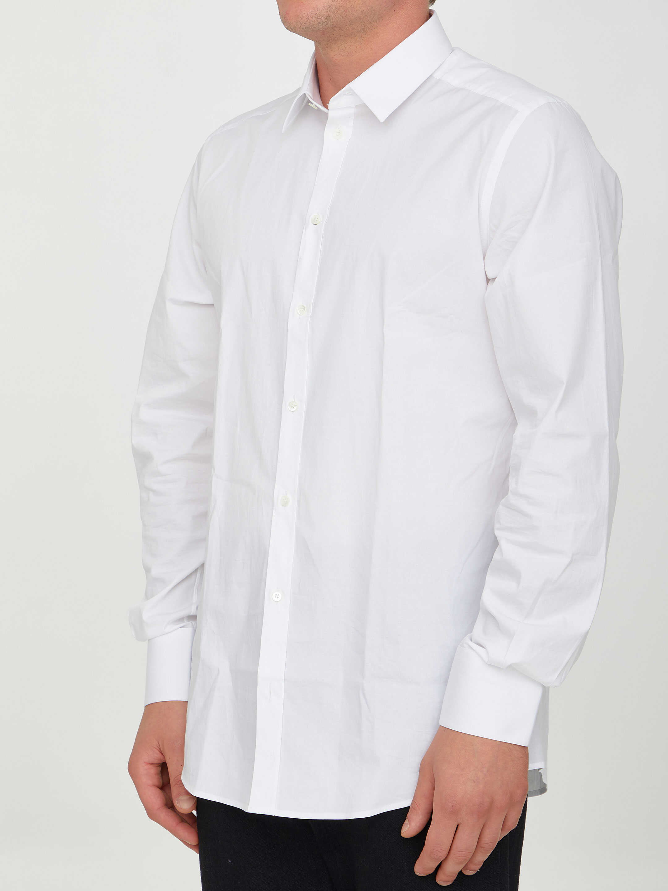 Long-sleeved shirt in white cotton. It features classic collar, front button closure and buttoned cuffs.