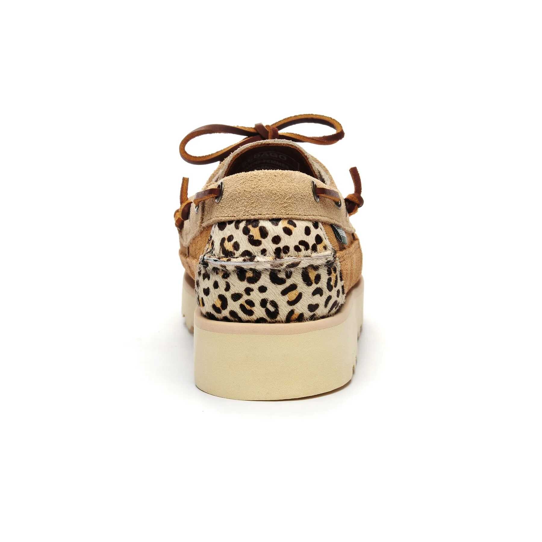 SEBAGO MOCCASIN- This sturdy outdoor moccasin has been handcrafted by combining suede with printed cowhide in a leopard animal pattern. Hand-sewn replicating the construction technique of Native American footwear, this iconic moccasin features a hand-stitched moc toe upper in 3 colors, strong and flexible tubular construction, leather laces, and a lightweight EVA sole for maximum comfort and shock absorption. Perfect for wearing outdoors and camping, they bear the noble name of the proud Cayuga Native American nation, also given to one of the glacial lakes in the state of New York.