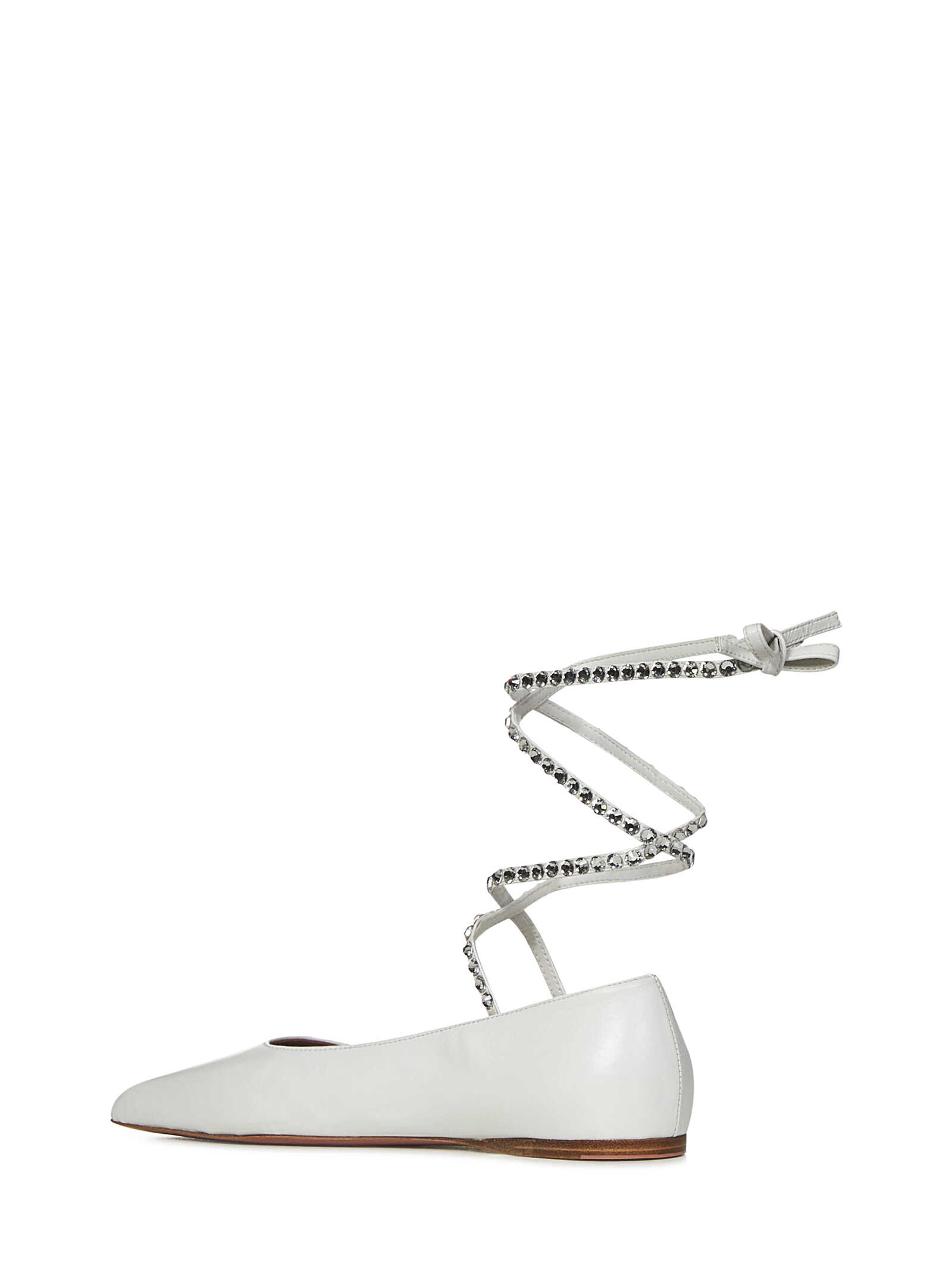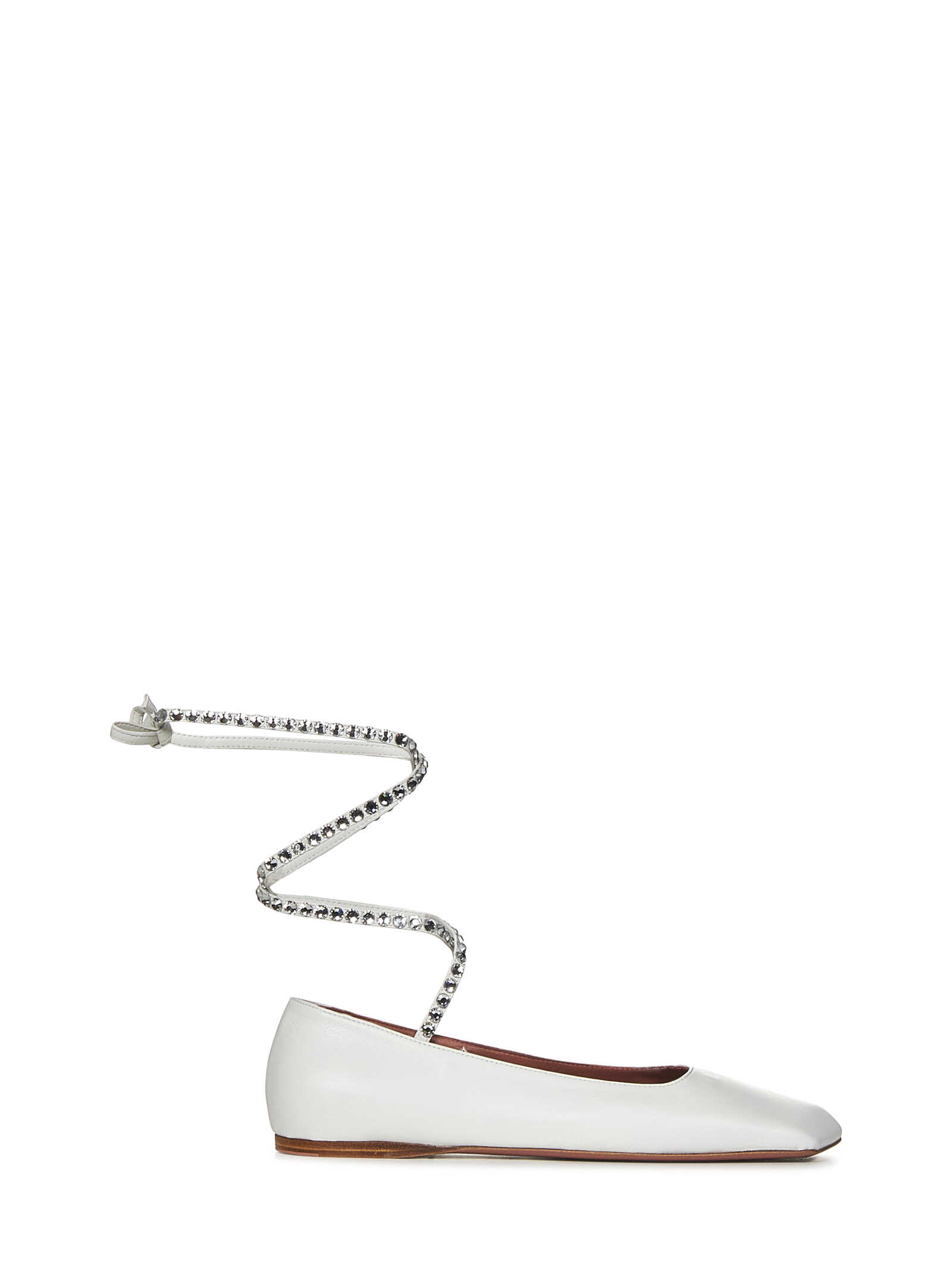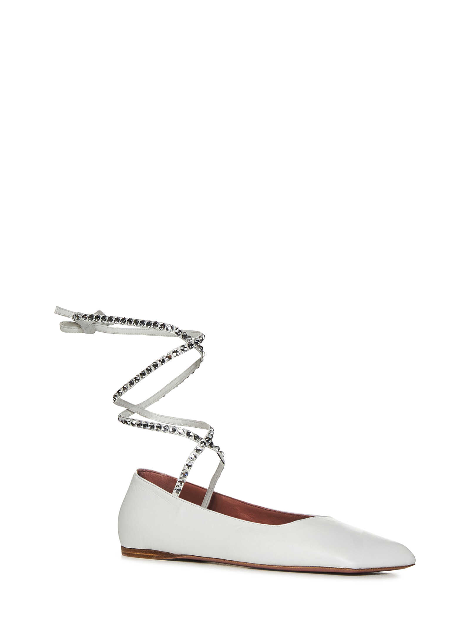 White nappa ballet flats with crystal-decorated straps and oblique square toe.