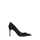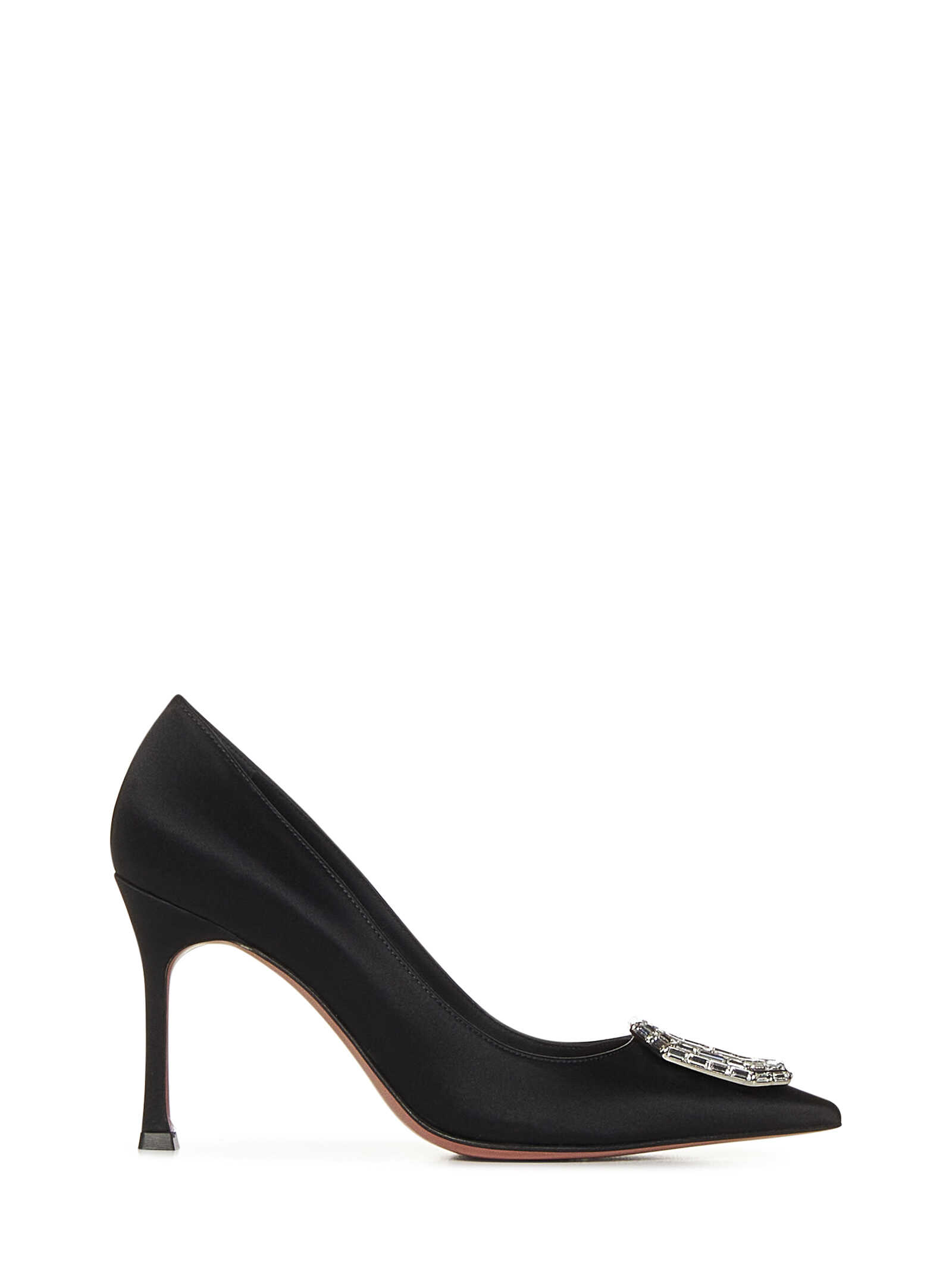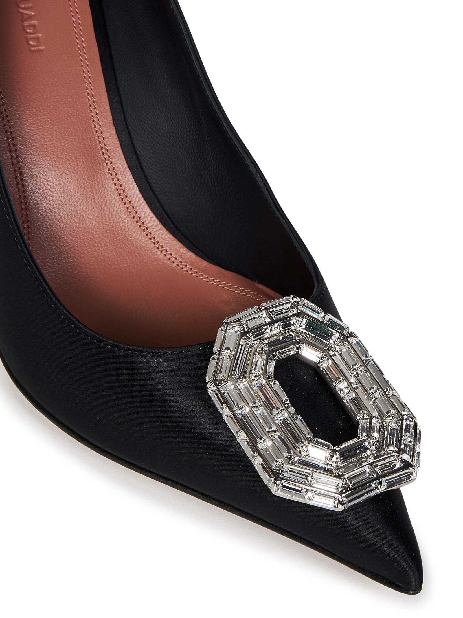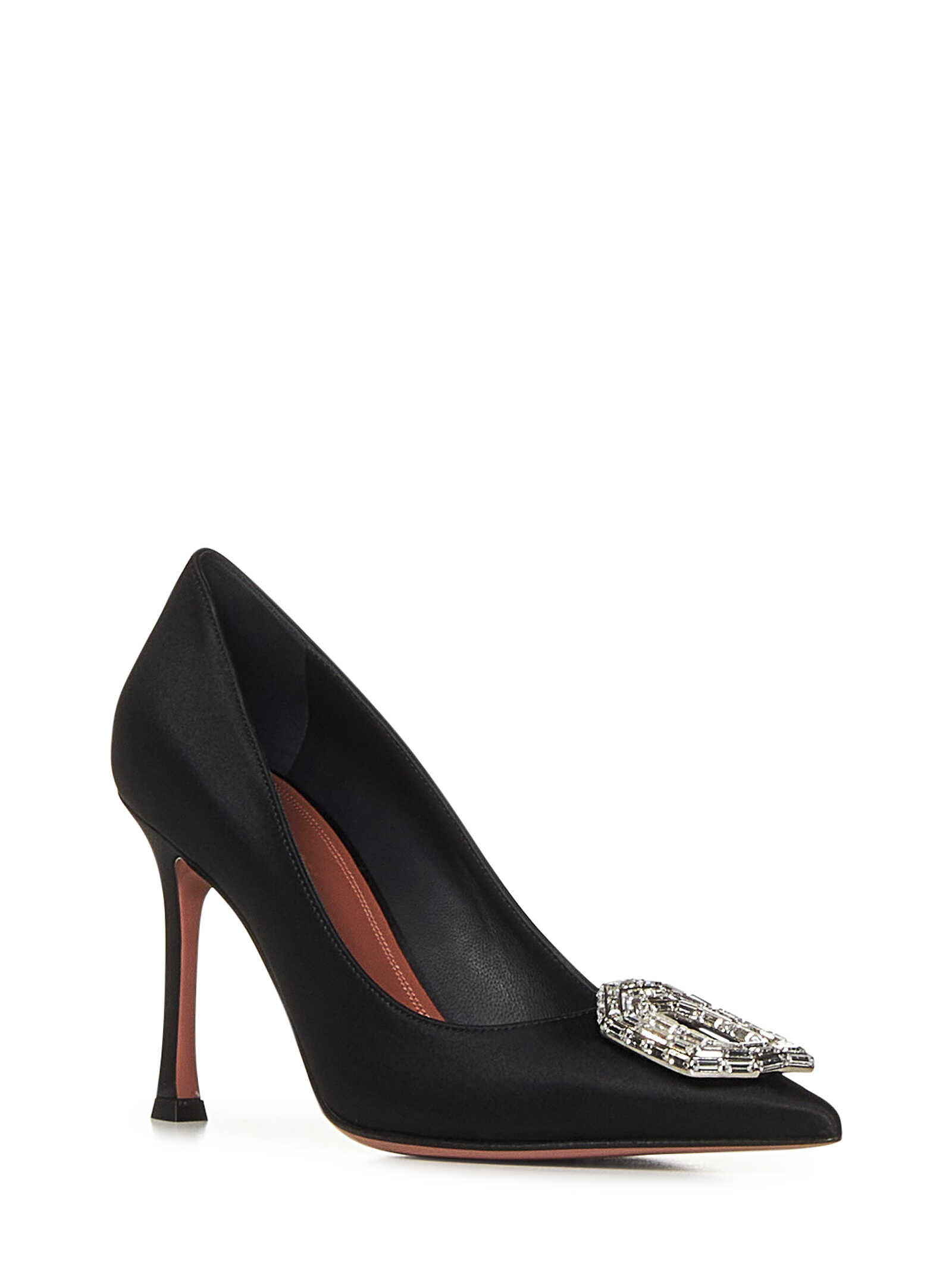 Black silk satin pumps with crystal-embellished rectangular accessory at toe.