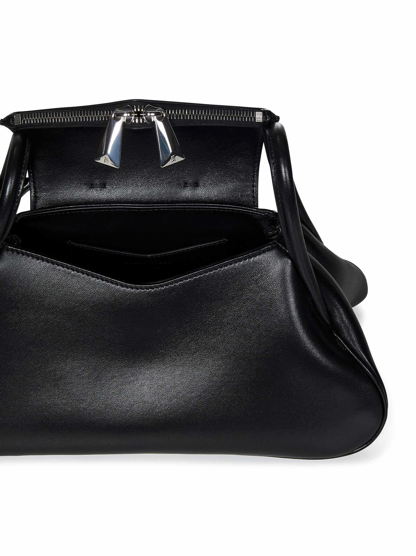 Black nappa shoulder bag with embossed logo and adjustable shoulder strap.