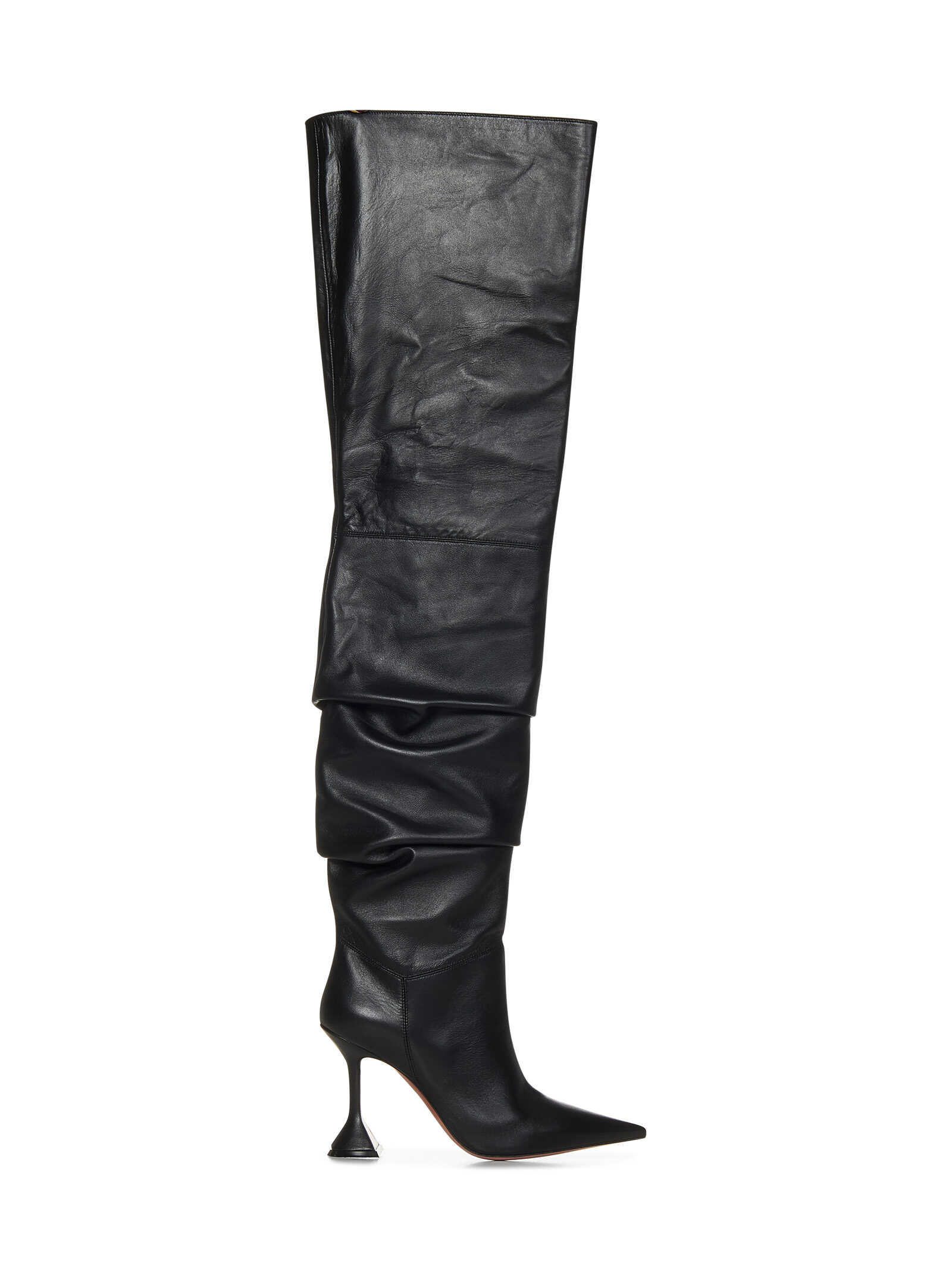 Black nappa thigh-high boots with hourglass heel.