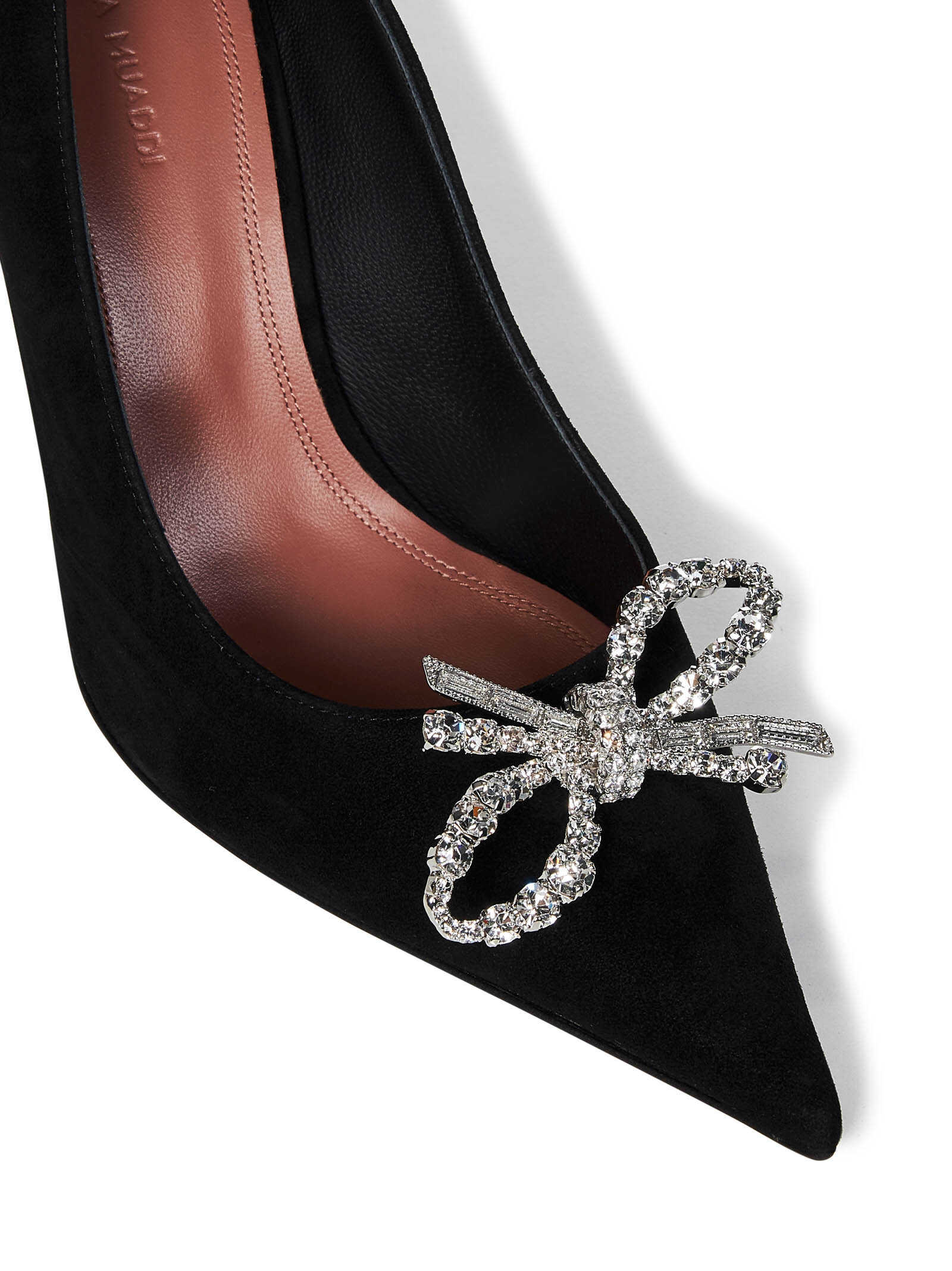 Black suede pumps with jewel bow on the toe and high stiletto heel.
