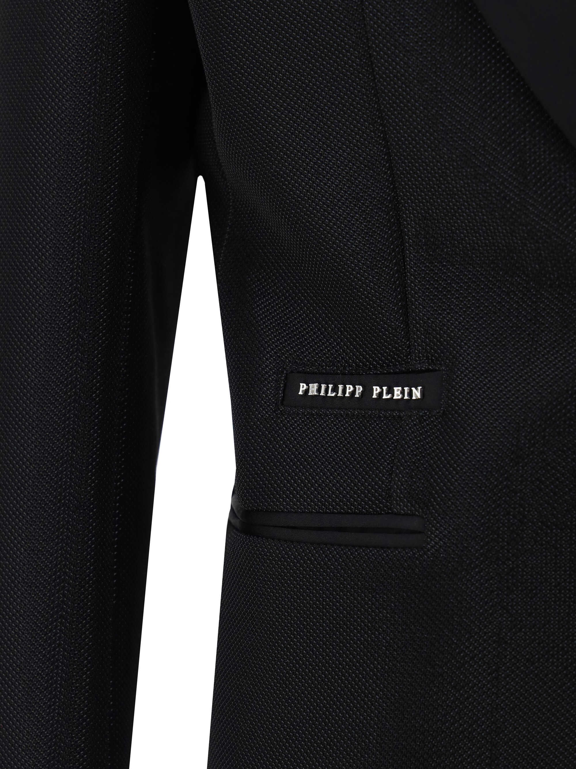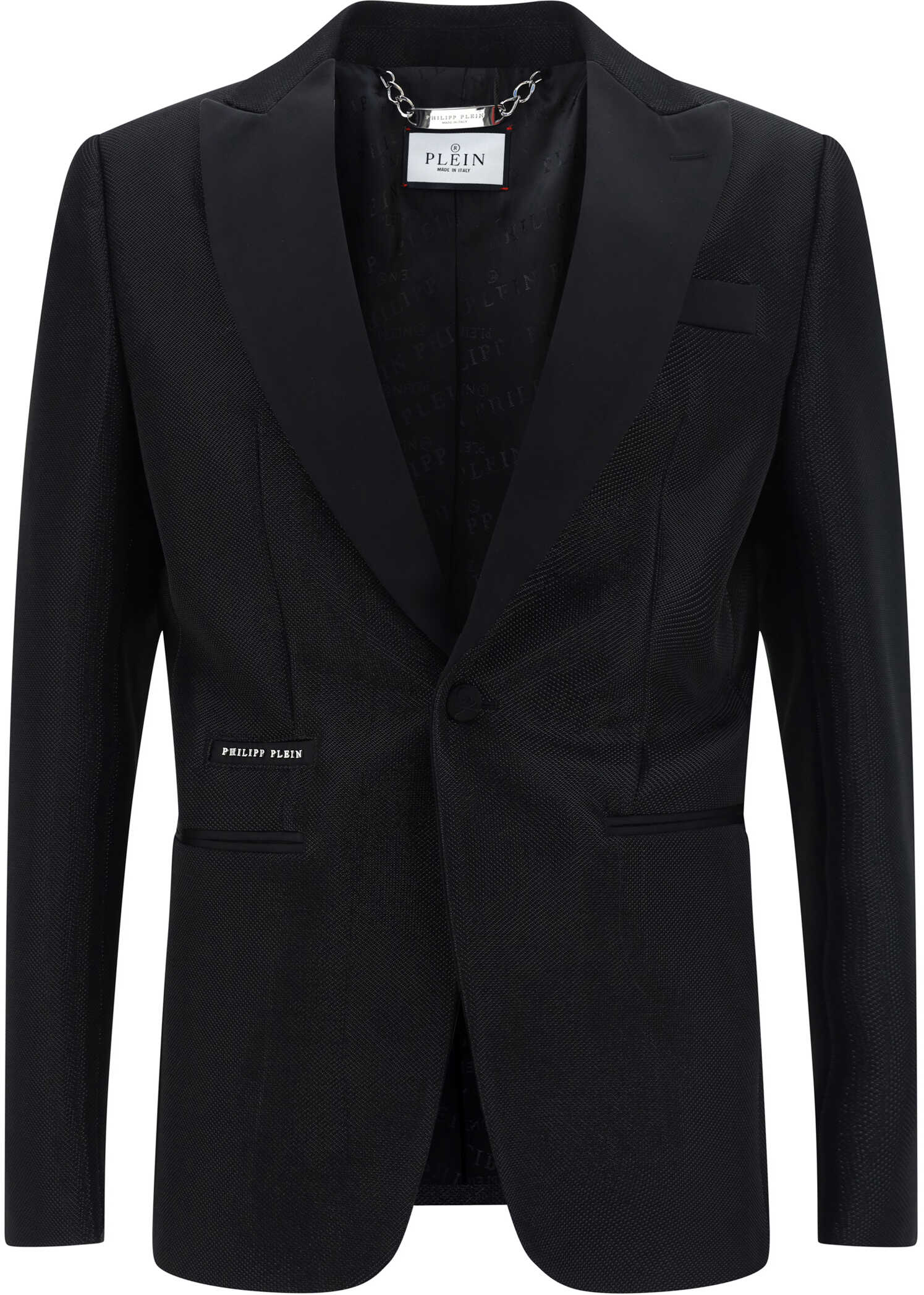 Blazer Jacket by Philipp Plein, double-breasted front button closure, classic lapels, two side welt pockets, two front welt pockets, back slit, all-over laminated effect design, metal plaque with iconic brand monogram on front, regular fit.