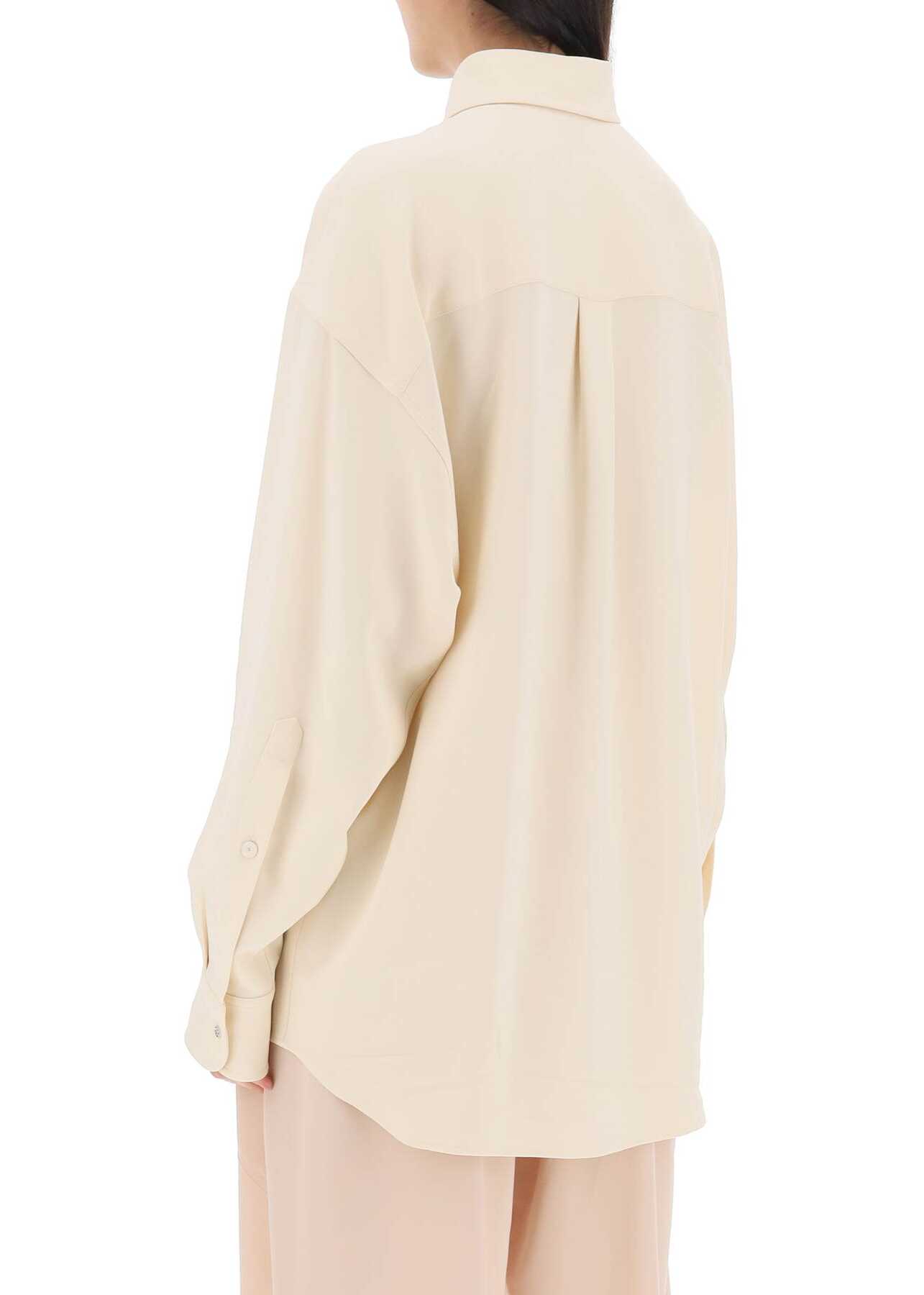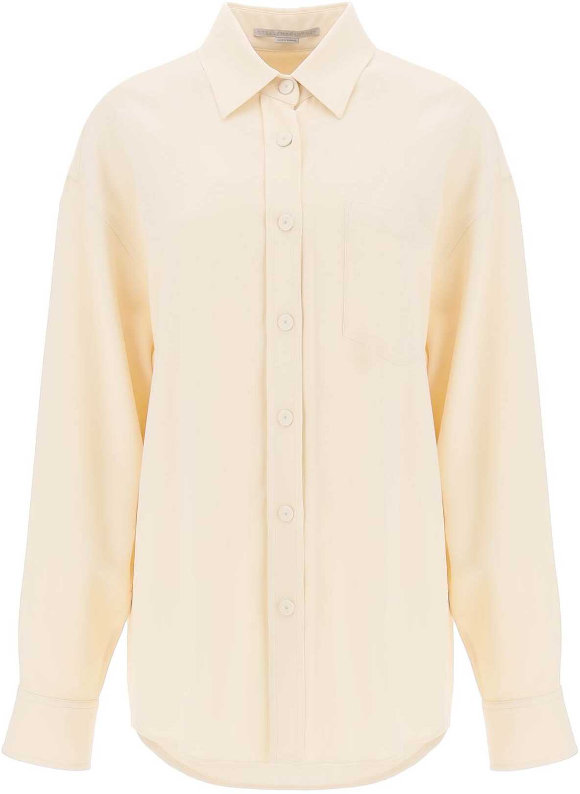 Stella McCartney shirt crafted in sustainable viscose crepe jersey, with an oversized fit enhanced by low-set sleeves. It features classic collar, american self-covered button placket, a chest patch pocket, rounded hem, cuffs with silver-tone S-Wave buttons and back yoke with box pleat. The model is 177 cm tall and wears size IT 40.
