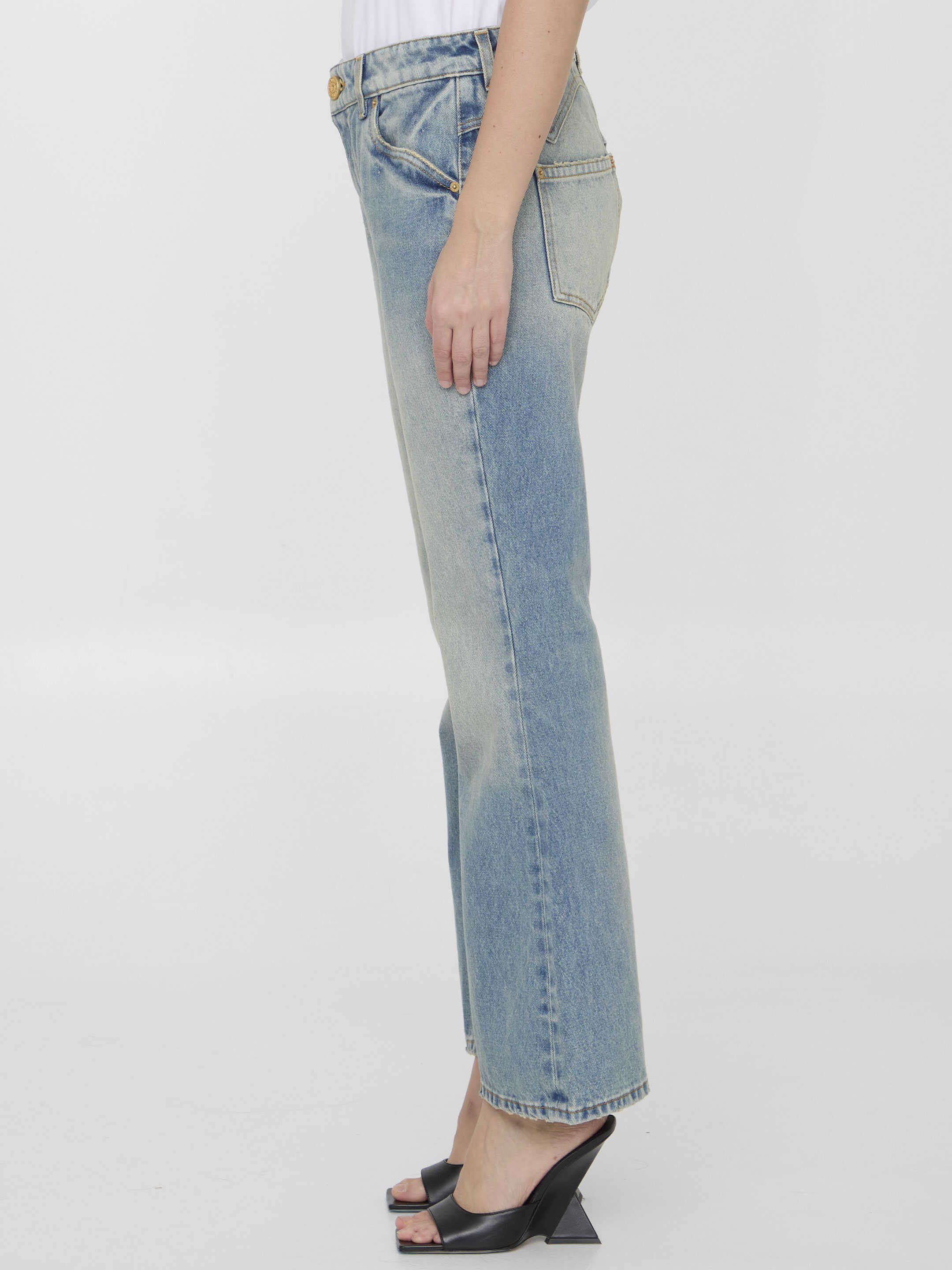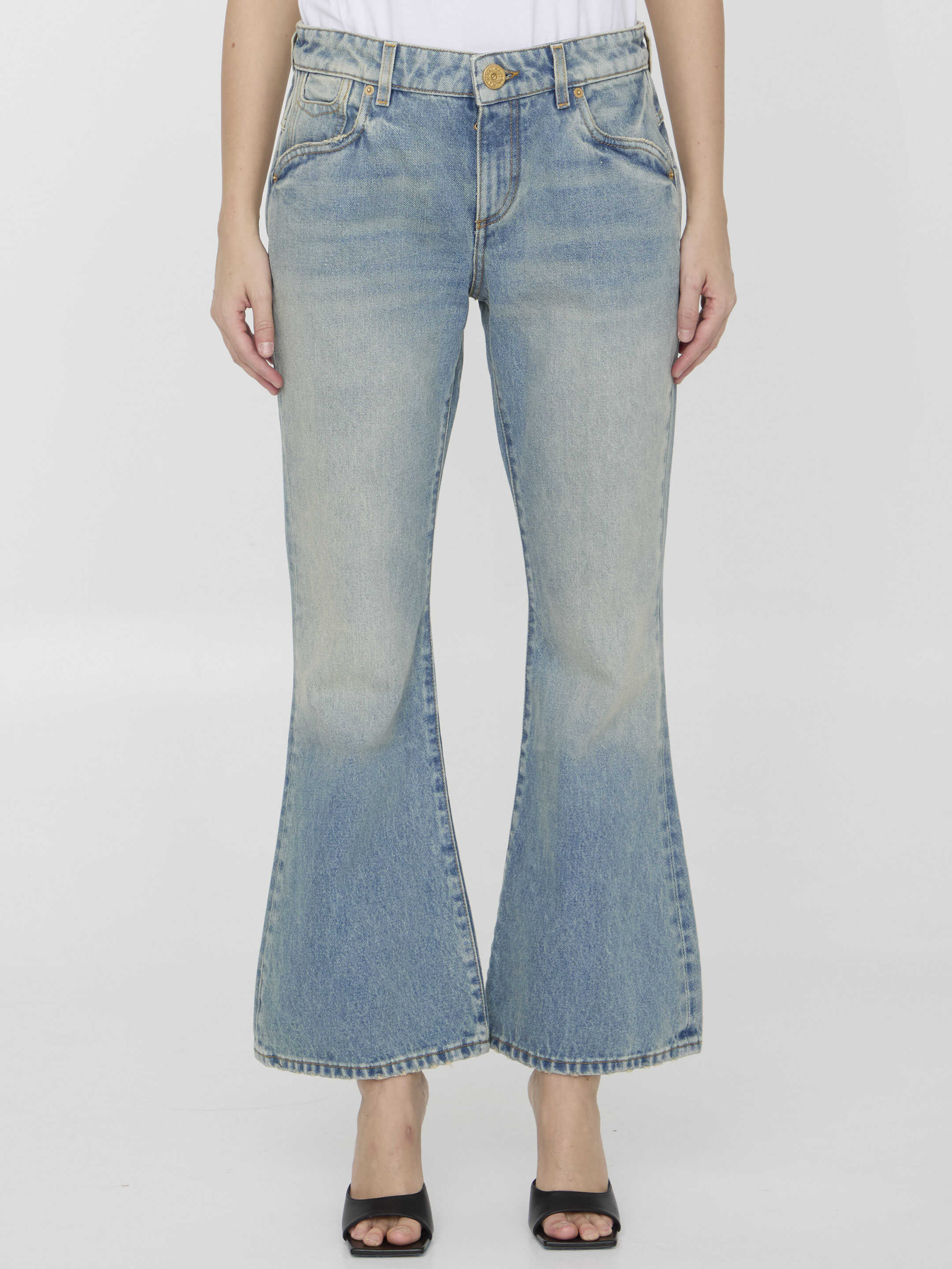 Low-waist Western bootcut jeans in vintage washed-out denim. It features zip and embossed gold-tone button closure, five-pocket design and belt loops. "Balmain Paris" embroidery at the back. Regular fit.