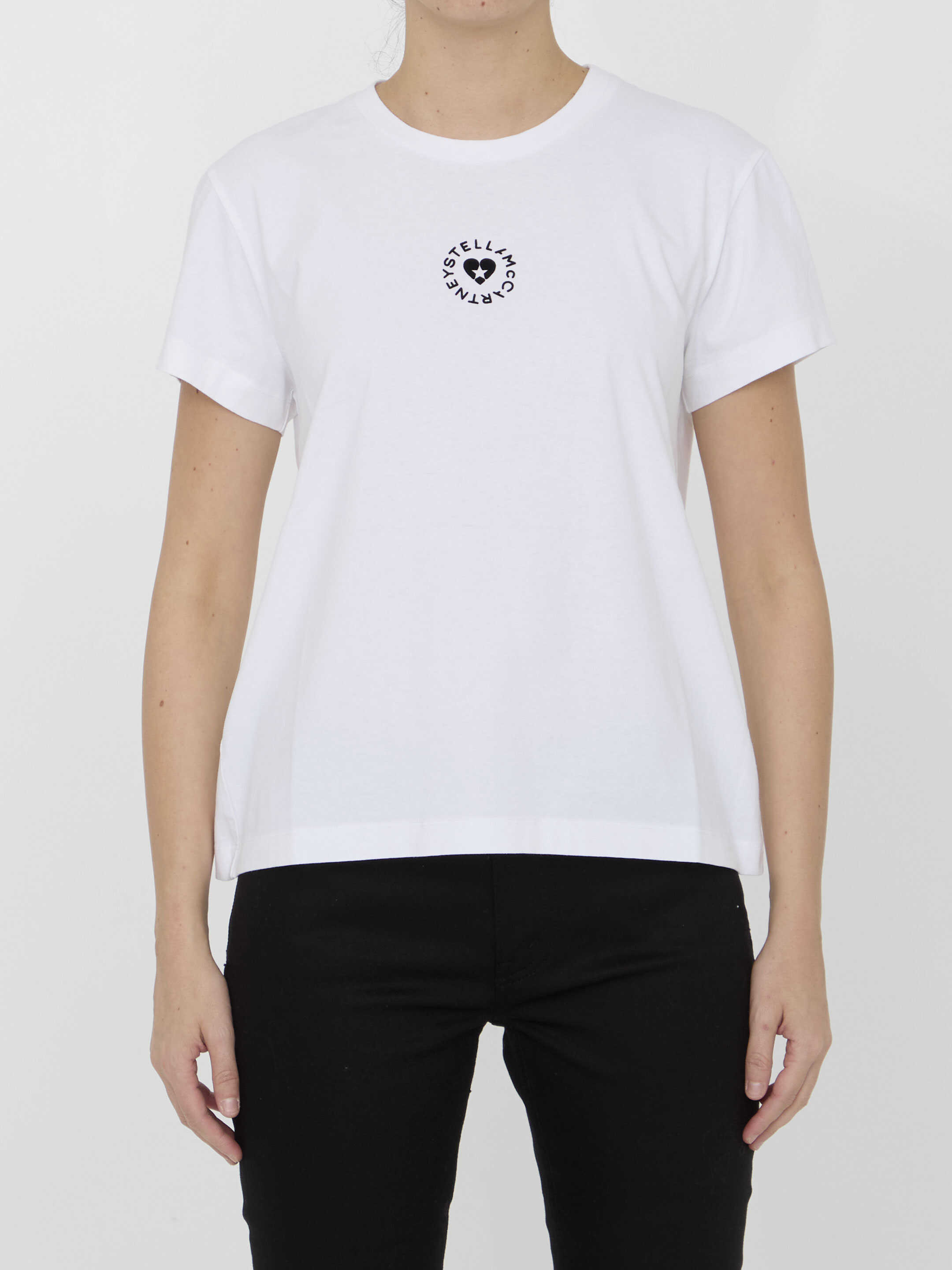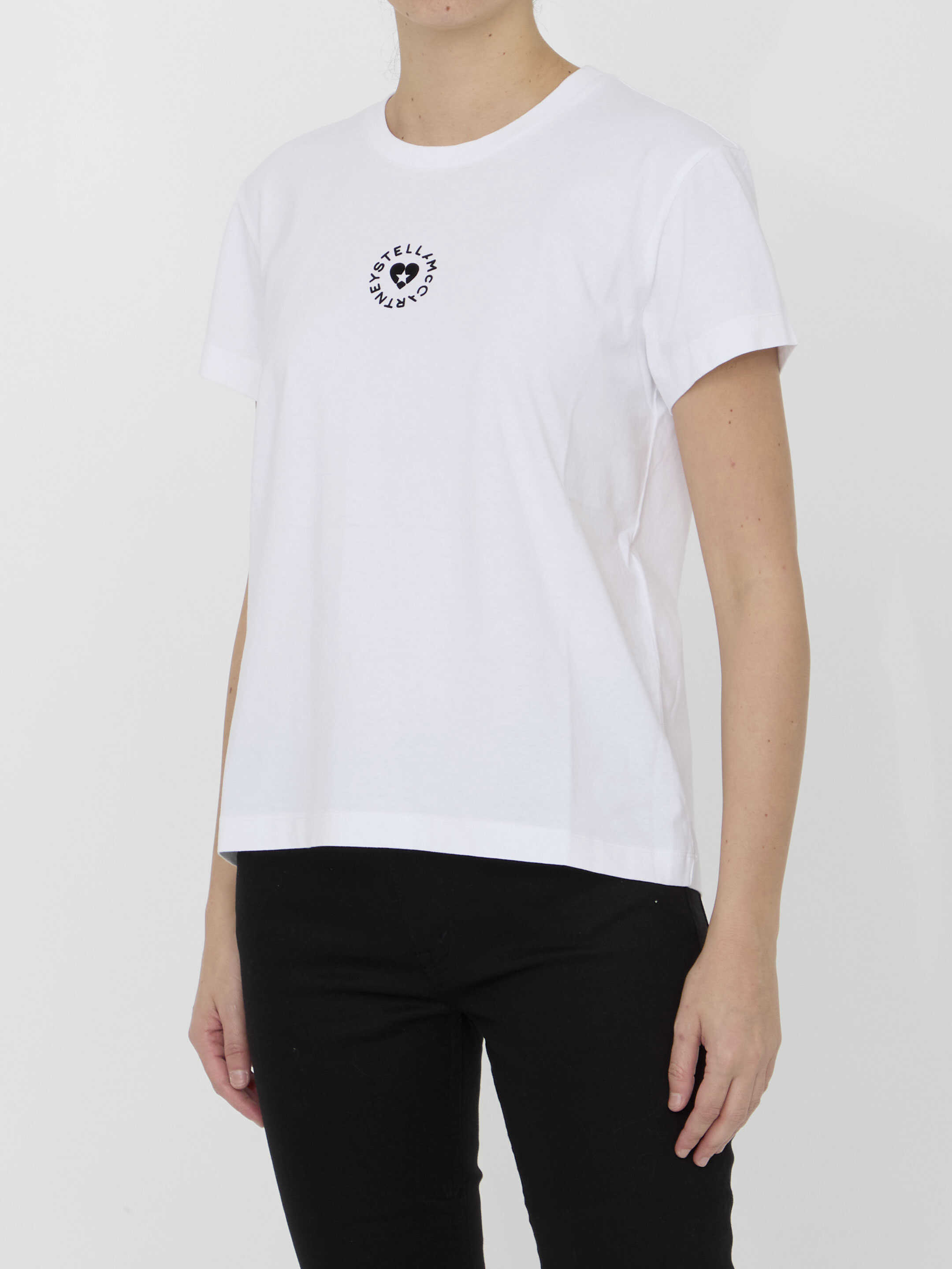 Short-sleeved crewneck t-shirt in white organic cotton jersey with Stella McCartney circular logo, Stella Star and heart-shaped motif on chest. Regular fit.