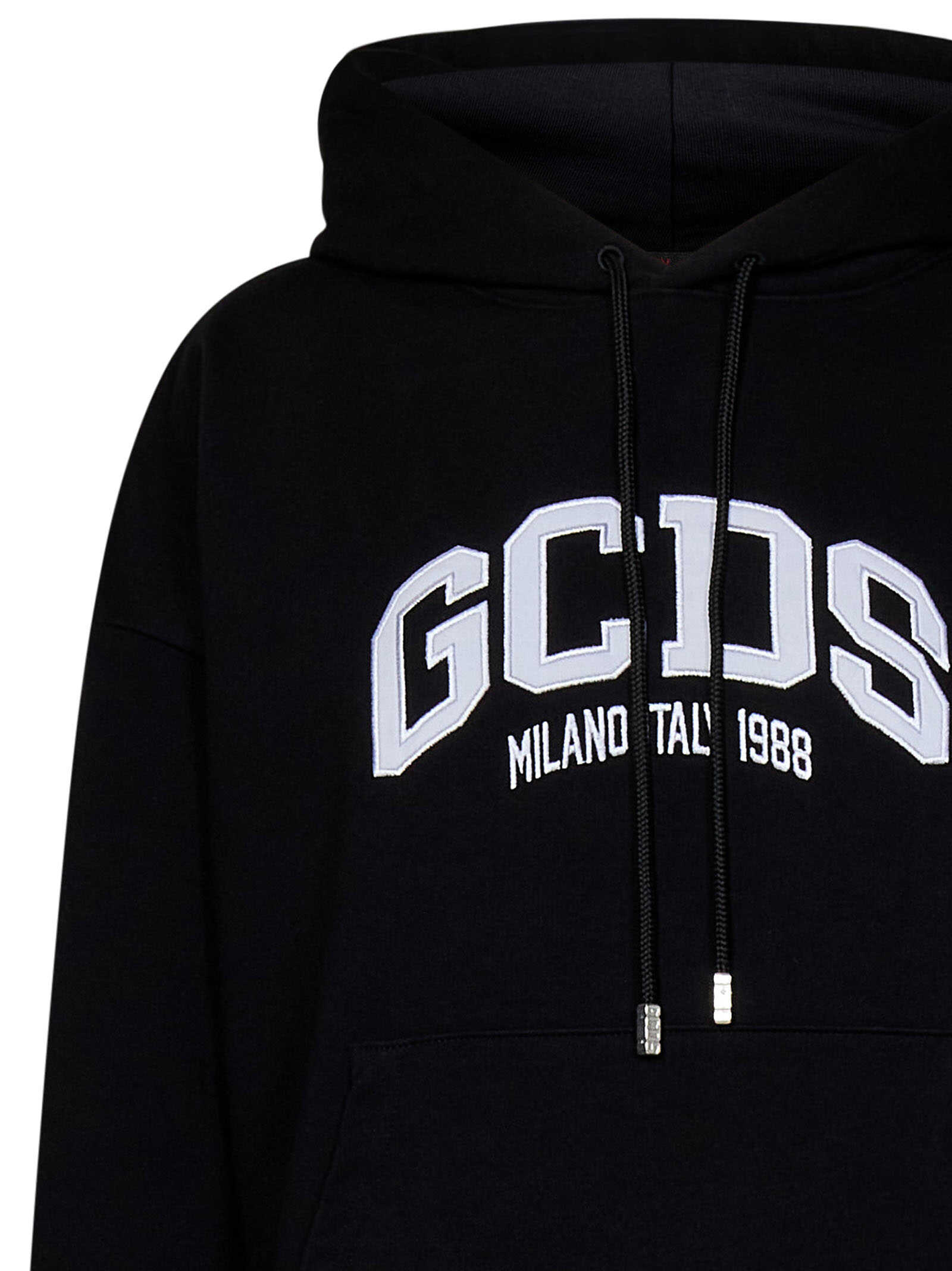Loose black cotton jersey hoodie with contrasting logo at front.