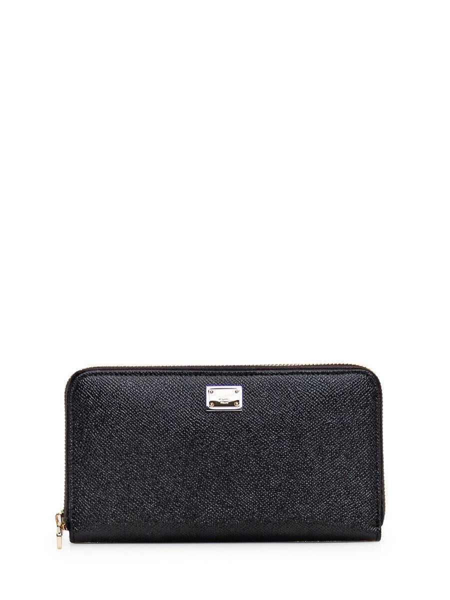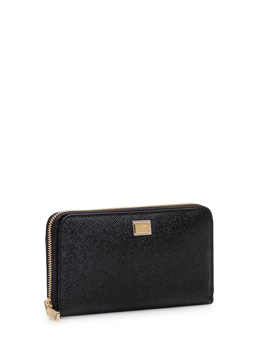 Black wallet in grained leather. Interior compartments for credit cards and bills. Inside zipper pocket. Zipper closure. Flat pocket on back. Gold metal logo plaque on front. Width:19 Height:10.5 Depth:2