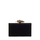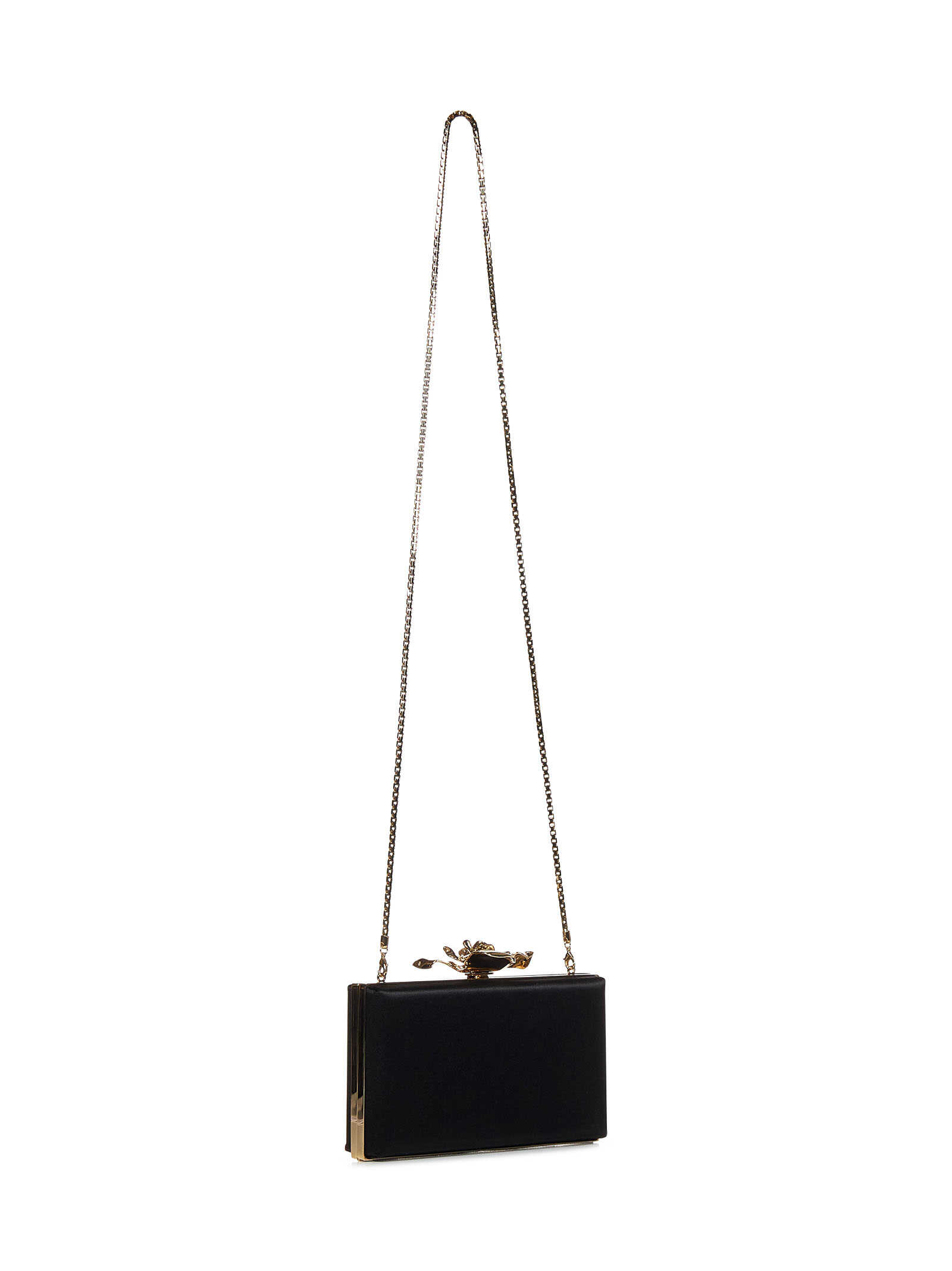 Black viscose and silk satin minaudiere clutch with flower clasp and chain shoulder strap.