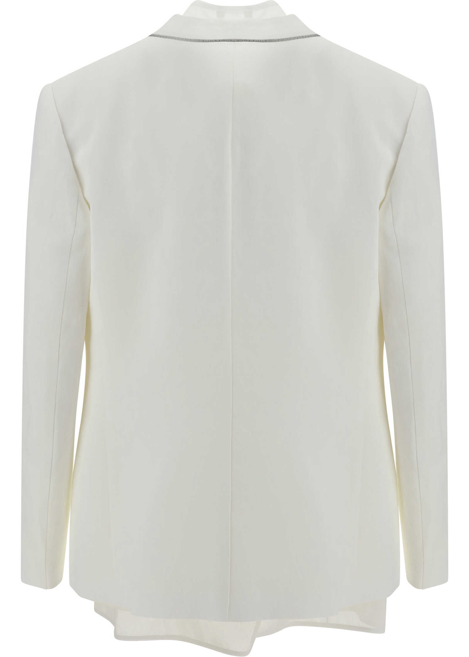 Cotton Blazer Jacket by Brunello Cucinelli, double-breasted front closure with concealed button, layered design with semi-transparent details, two side flap welt pockets, one front welt pocket, lapel-less, structured shoulders, feature Monili chain at back, regular fit.