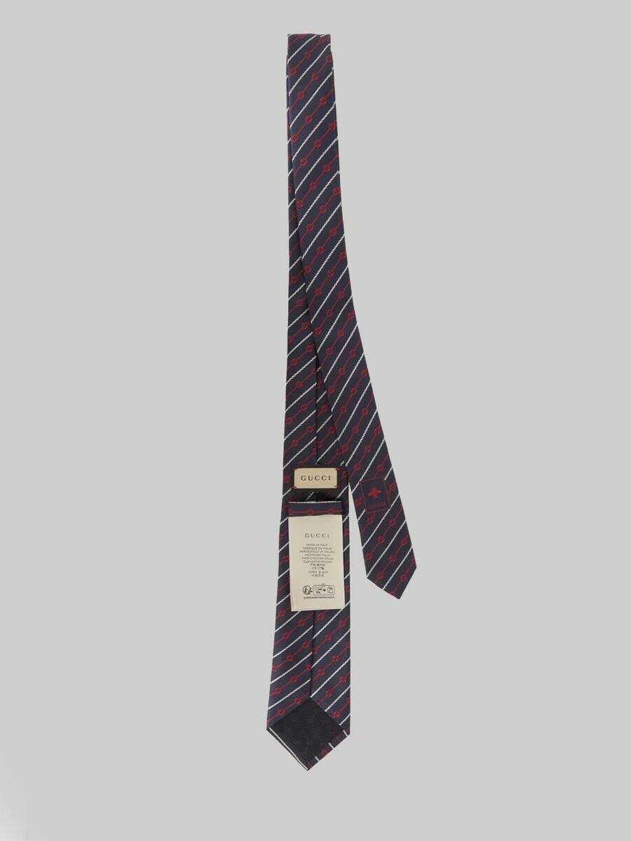 Navy blue and red silk tie with round Interlocking G jacquard motif. Gucci bee label on the back.