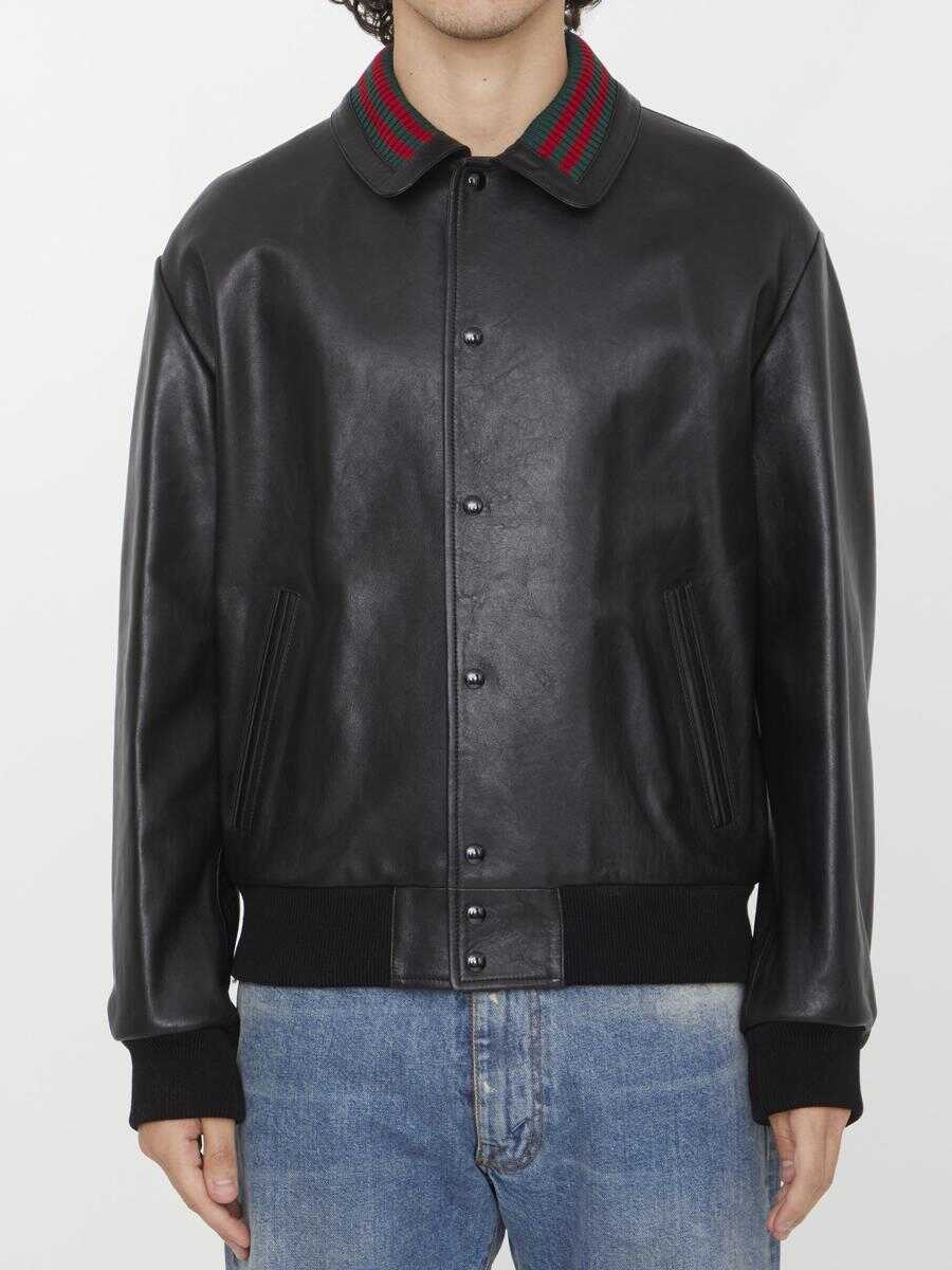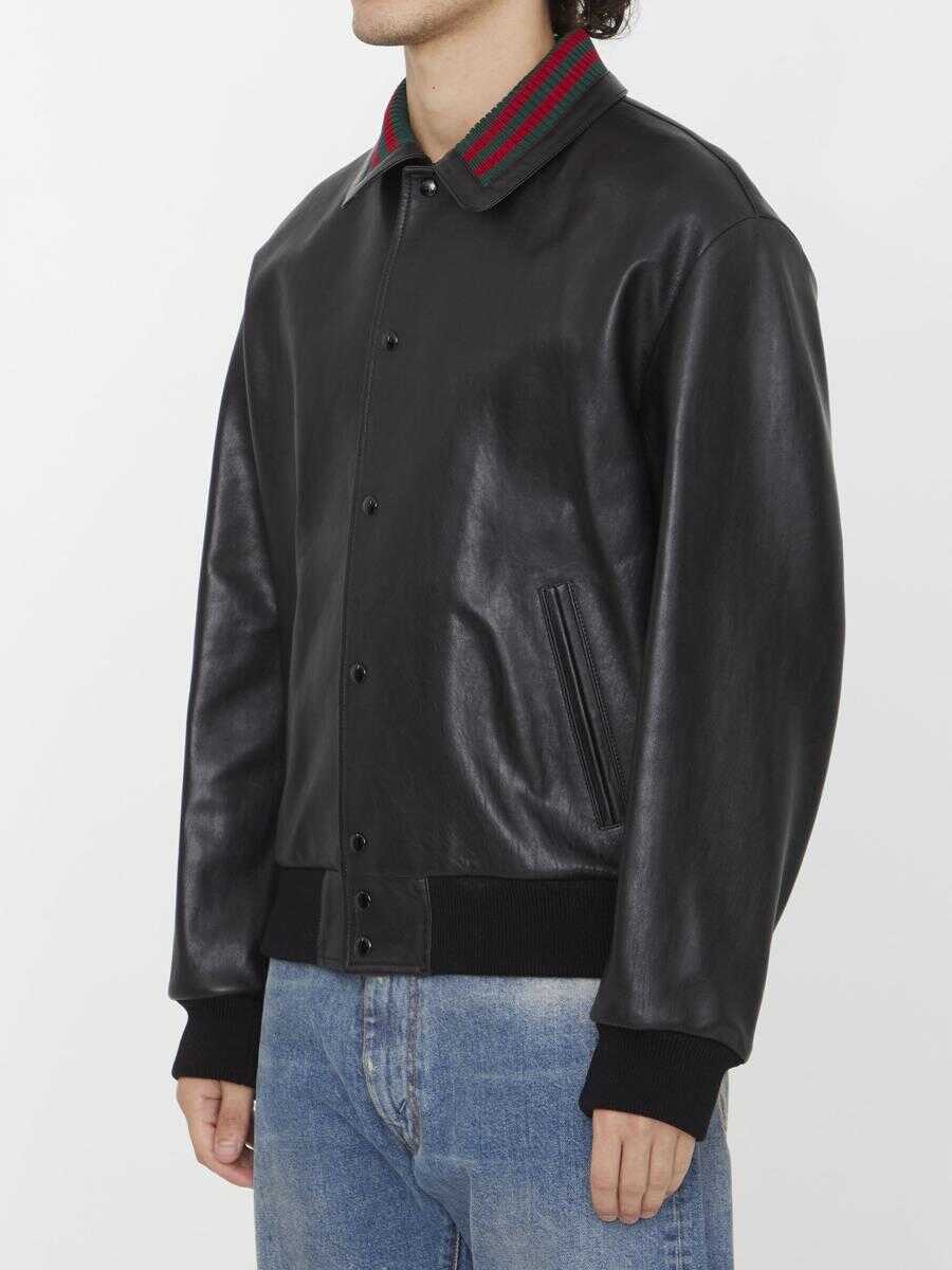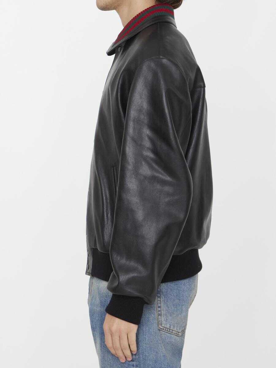 Bomber jacket in black shiny grainy leather with green and red Web detail on collar. It features front press-stud closure, two side welt pockets and ribbed trims on collar, cuffs and hem. Any leather imperfections are not to be considered factory defects, but a peculiarity of the material. Regular fit.