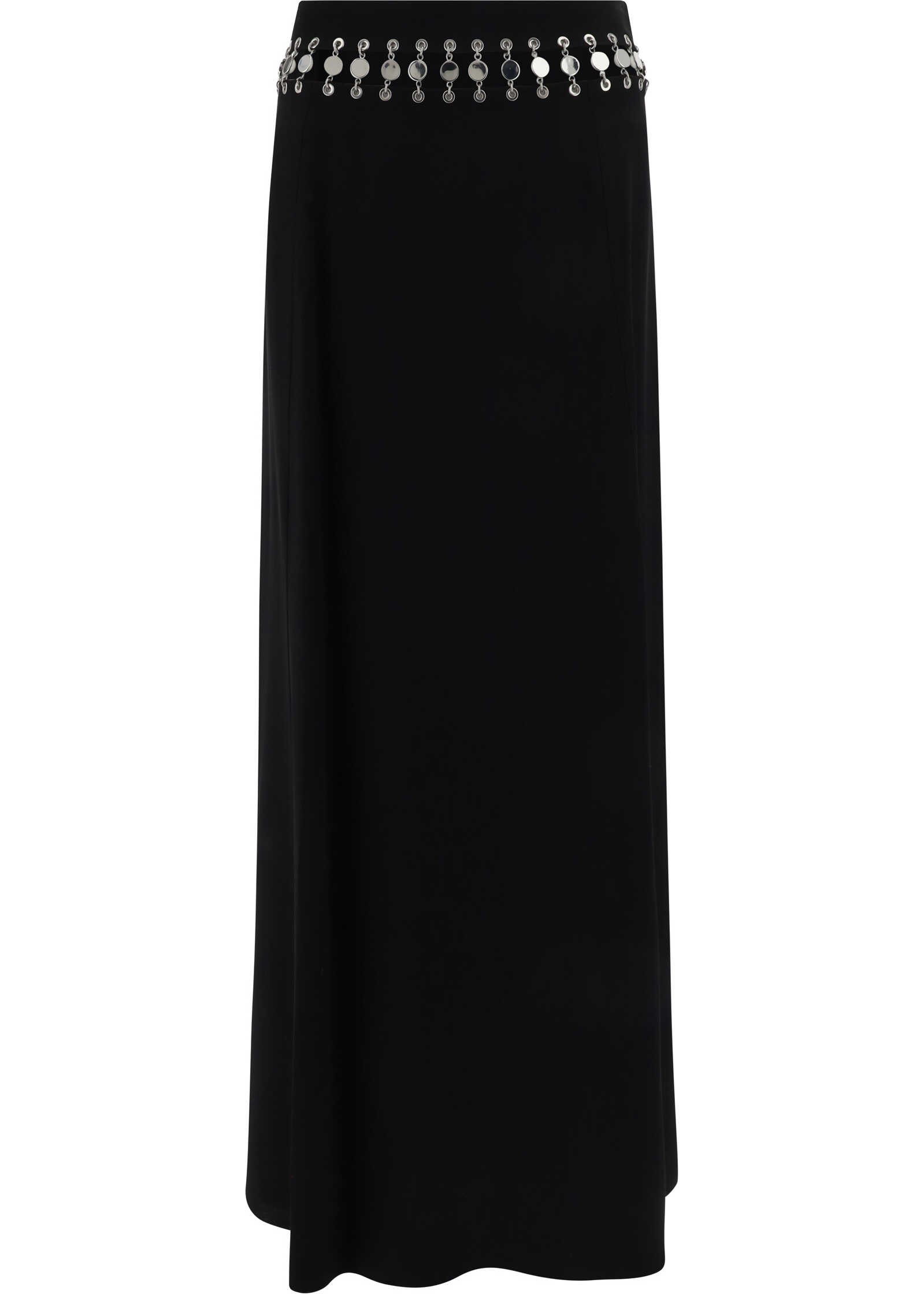 Long Skirt by Paco Rabanne, back panel zipper closure, deep back slit, cut-out detail waistband embellished with mirrored metal embellishments, monochrome design, regular fit.