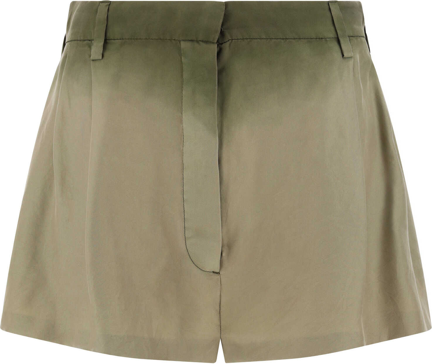 Silk Shorts by Prada, concealed front button closure, two side slash pockets, two back welt pockets with iconic enameled triangular brand signature plaque applique, waistband loops, shaded effect design.