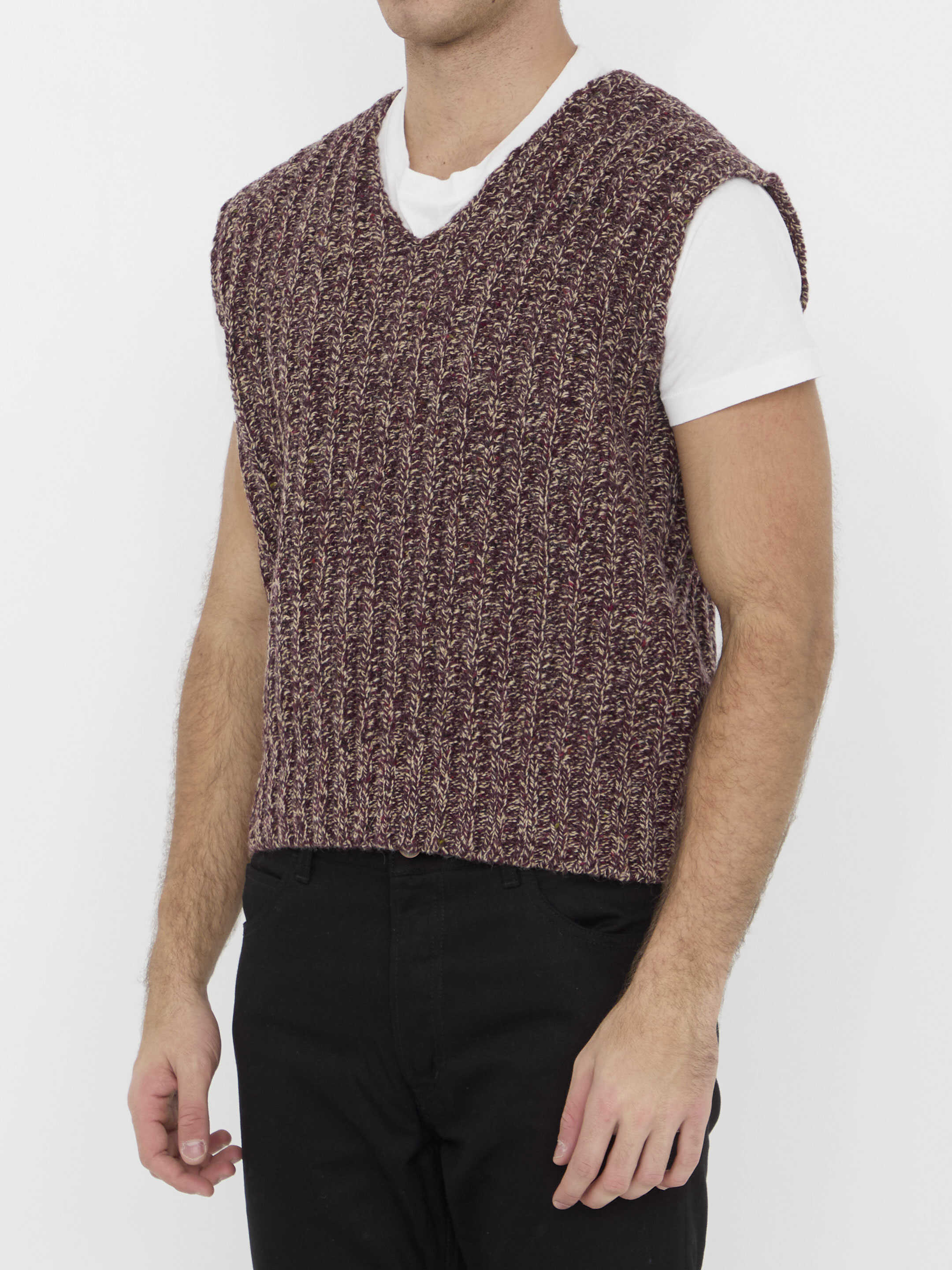 Bordeaux chunky braided knit vest with V-neckline. Four Stitches detail at the back. Regular fit.