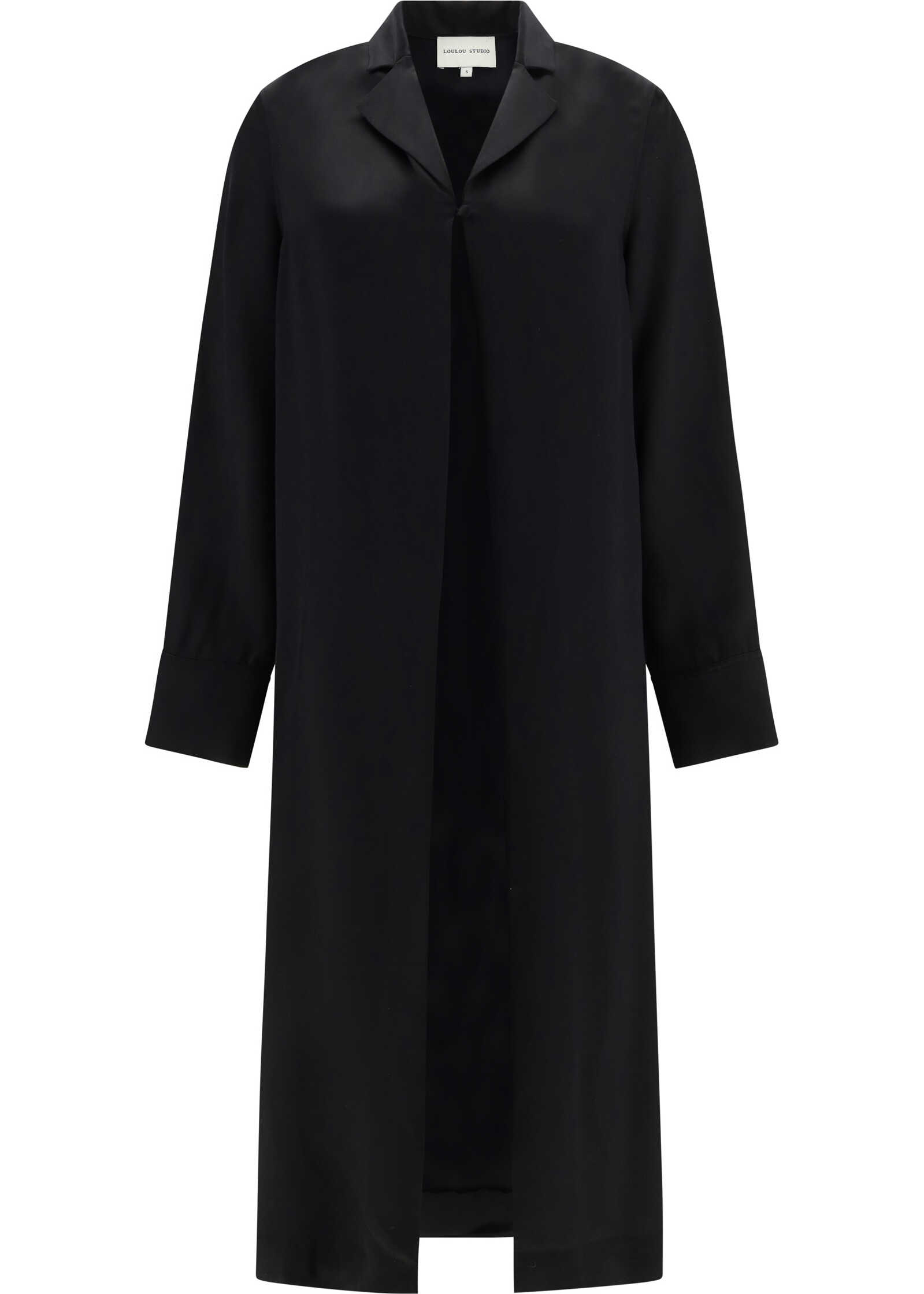 Silk Long Blouse by Lou Lou Studio, classic lapels, single button front closure, monochrome pattern, adjustable sleeves by buttons.