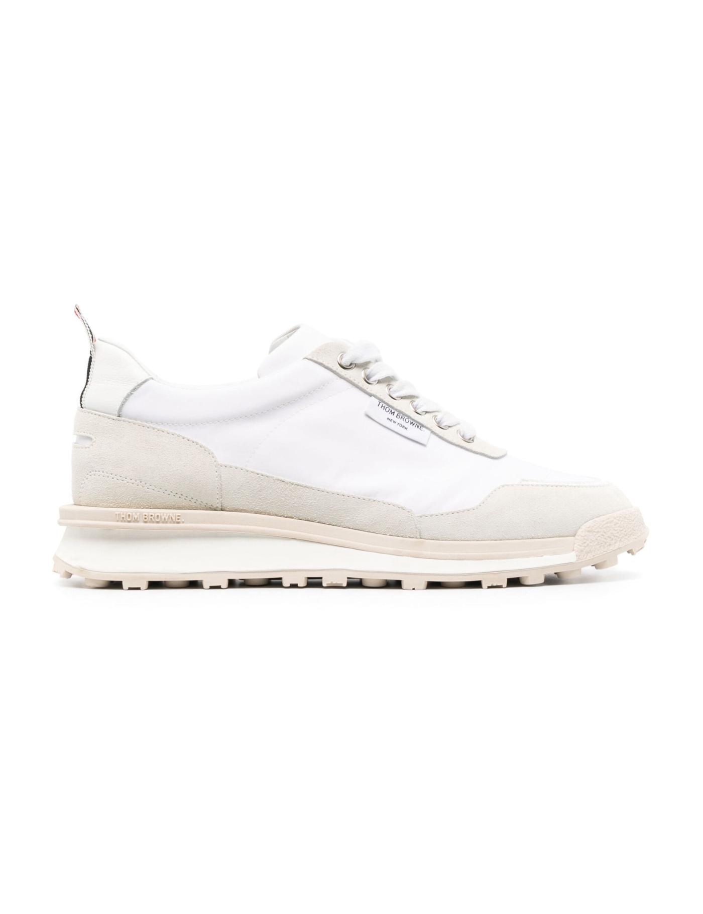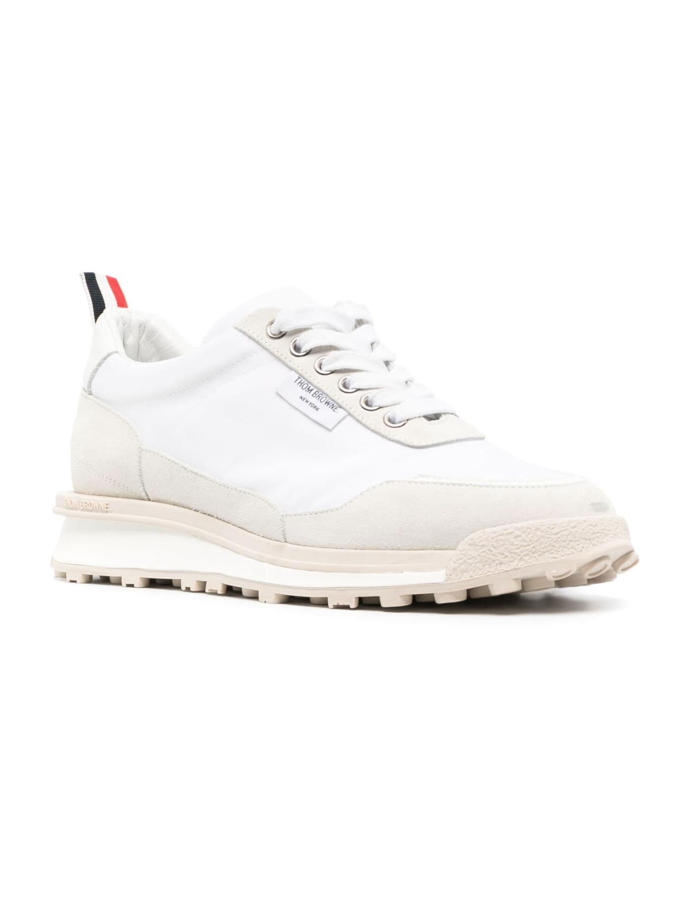 Meticulously crafted from suede and leather panels, these sneakers by Thom Browne arrive in a minimalist white and beige colourway. Subtle branding can be found throughout, including embossed logo lettering on their rubber sole, as well as iconic red, blue and white stripes on the pull tab.
