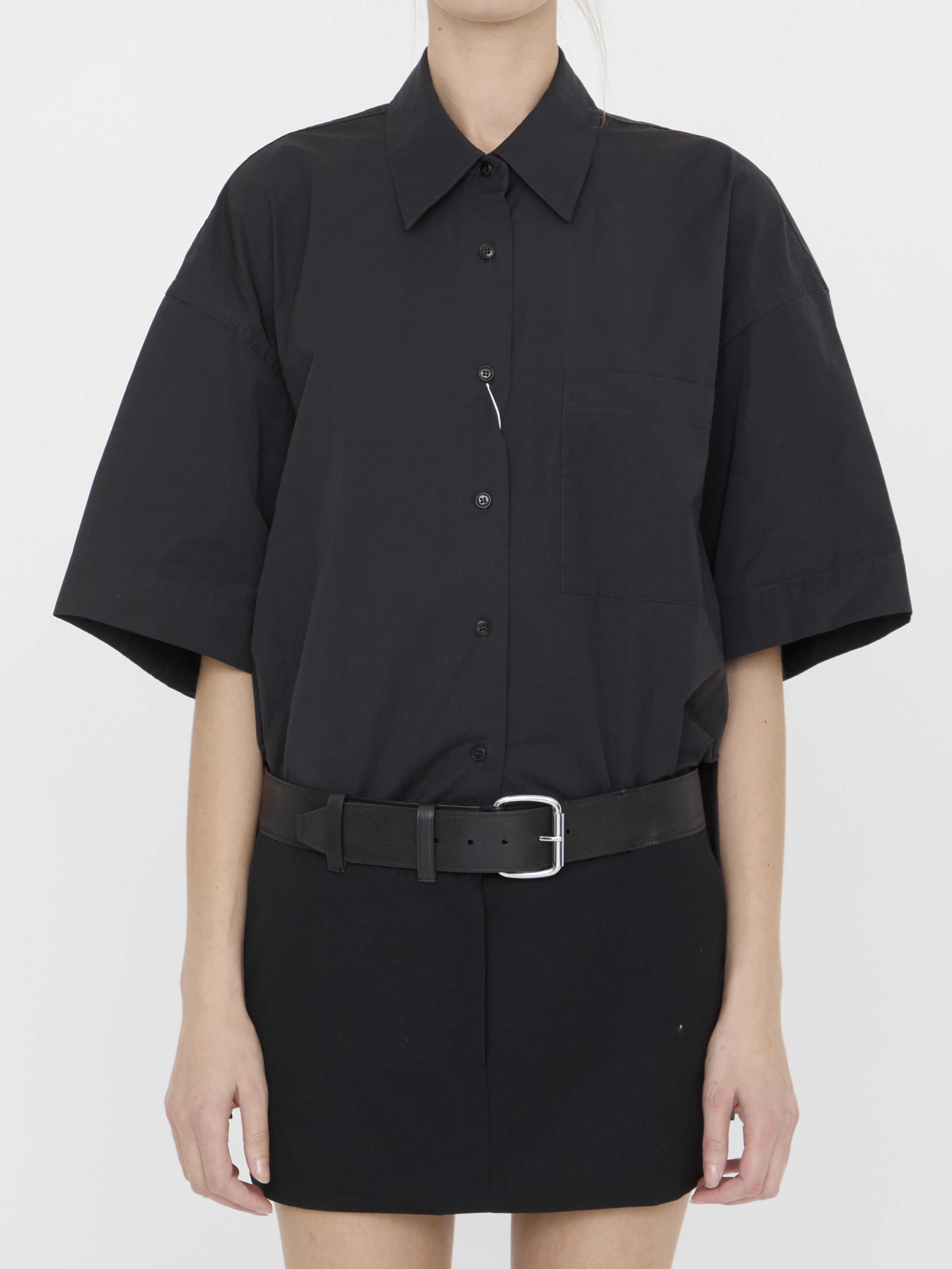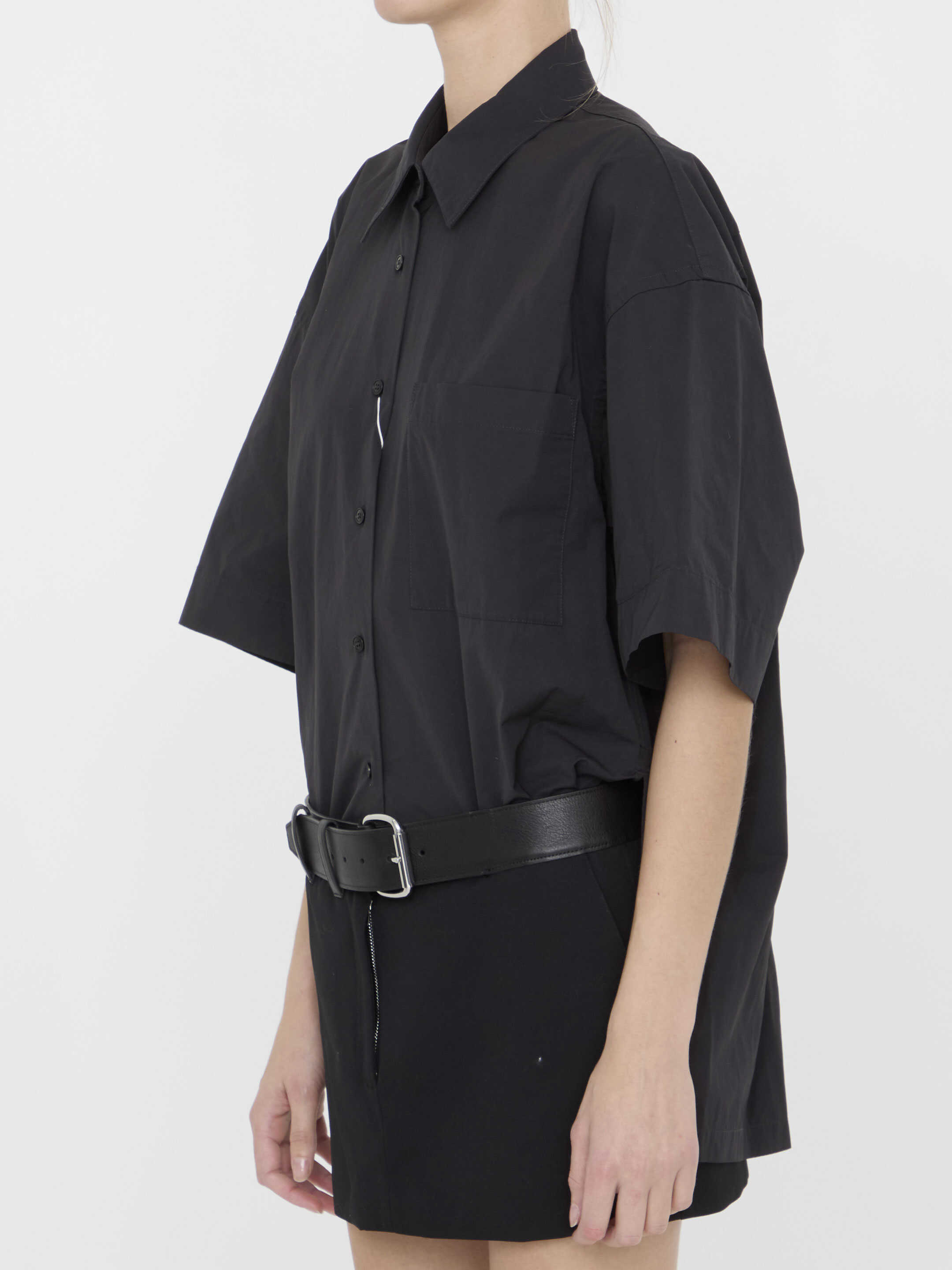 Short-sleeved black mini shirtdress with shirt cotton bodice and wool skirt with leather belted waistband. It features pointed collar, front button closure and two side welt pockets.Shirt drapes over back. Fitted cut.