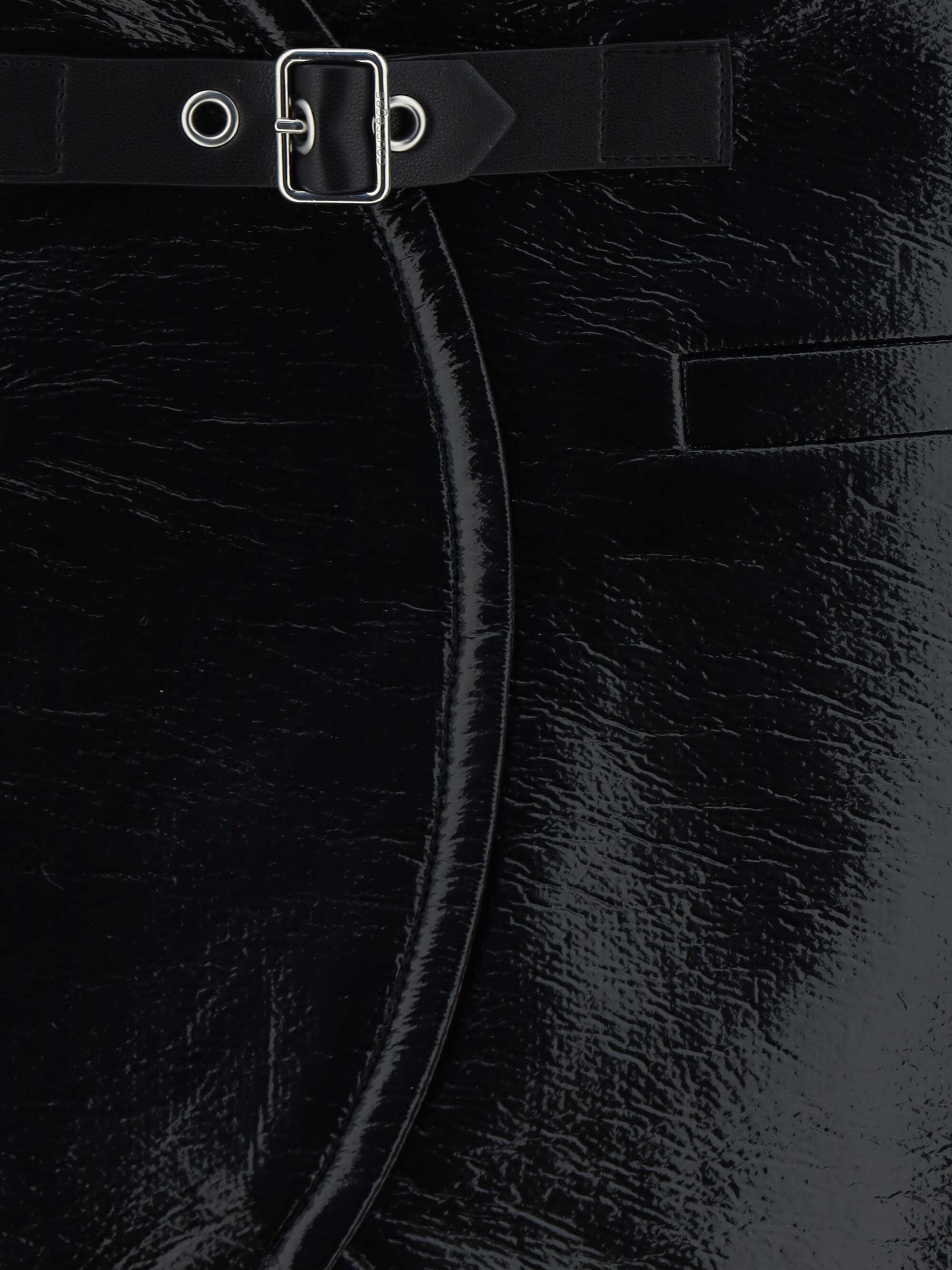 Cotton Miniskirt by Courrèges, concealed zipper closure on side panel, two welt pockets on front, asymmetrical hem, adjustable buckle detail on front, shiny effect coated cotton, slim fit.