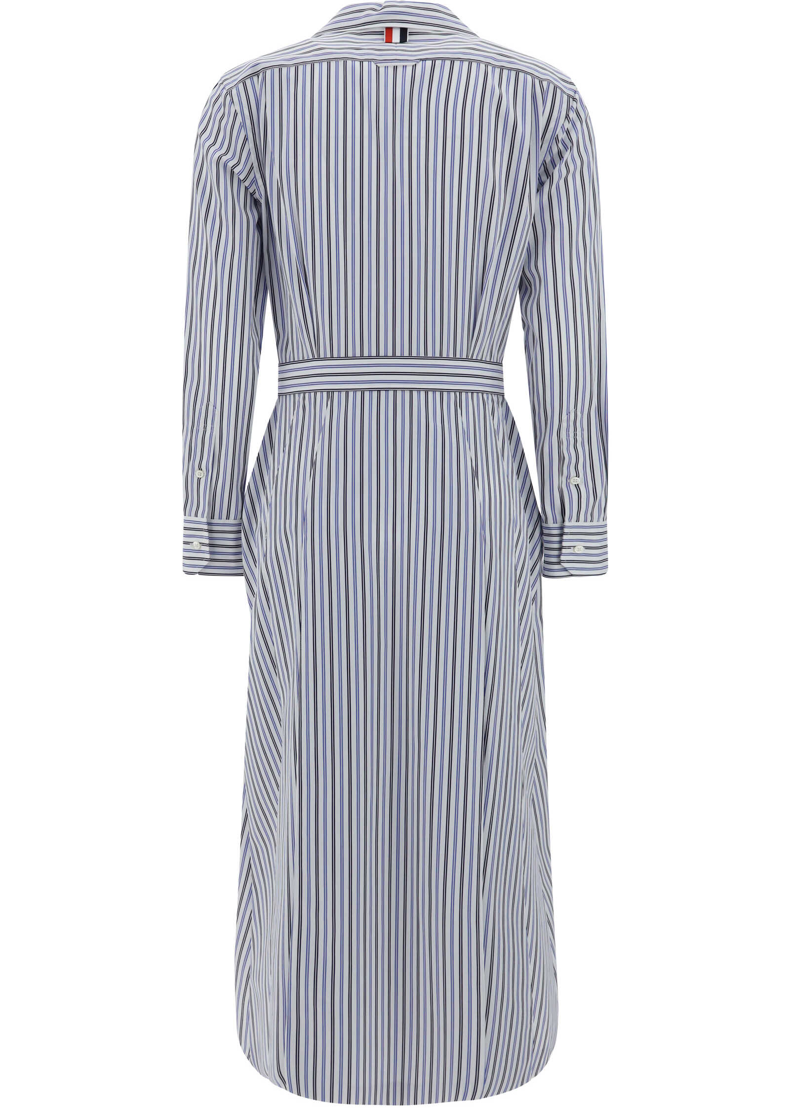 Cotton Chemisier Dress by Thom Browne, featuring classic lapels, contrasting front button closure, button-adjustable cuffs, two side welt pockets, ruffle skirt, iconic brand logo patch appliqué on front, striped design, regular fit.