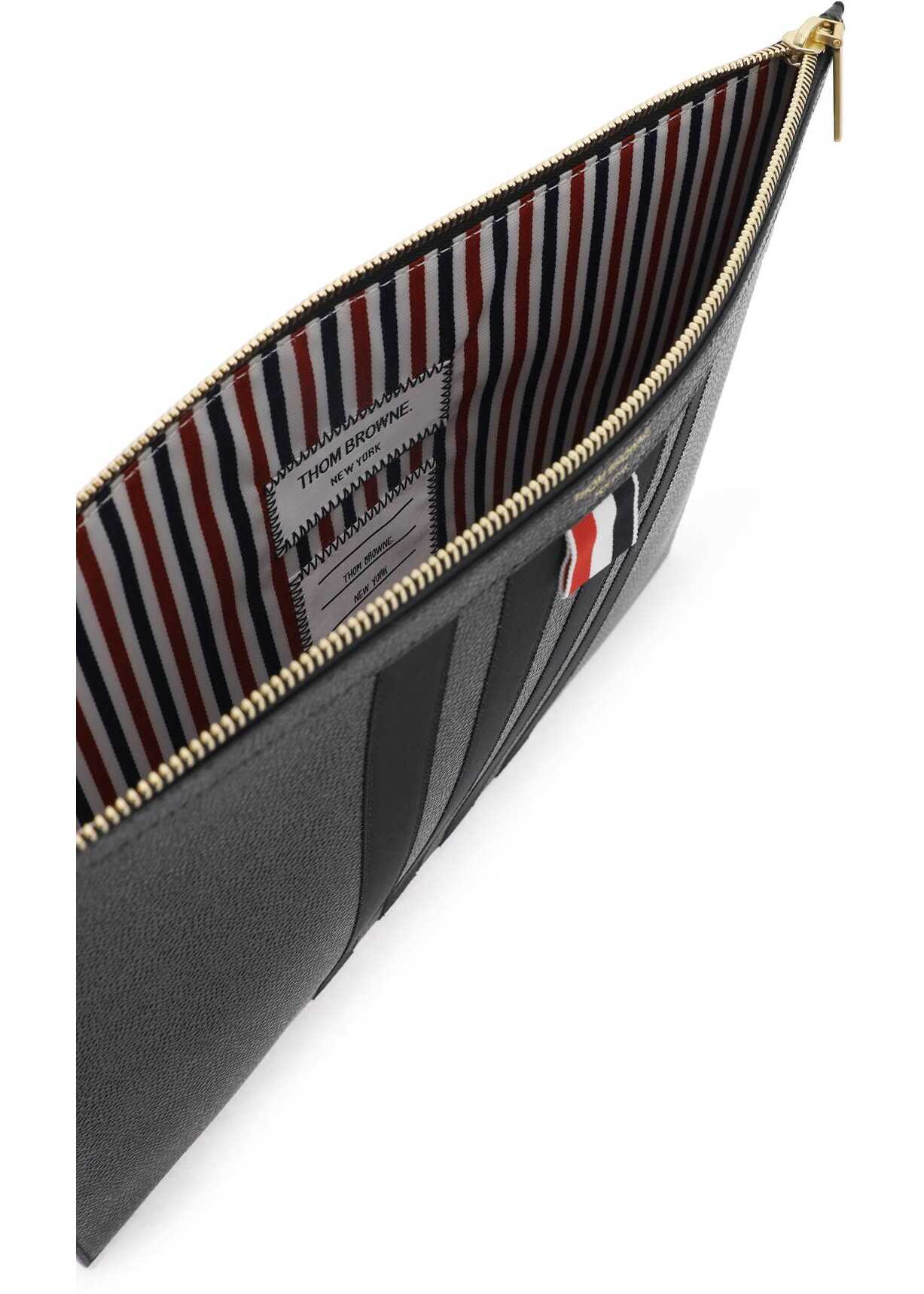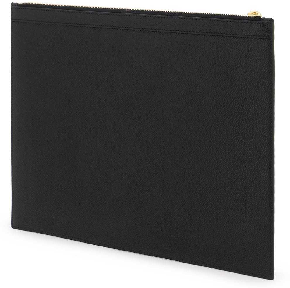 Medium document holder pouch by Thom Browne in pebbled grain leather with tone-on-tone gros grain 4-Bar applied on front. Gold-finished metal zip closure, gold-tone logo print on front and rear detail in the iconic tricolor ribbon. Tricolor striped fabric lining.