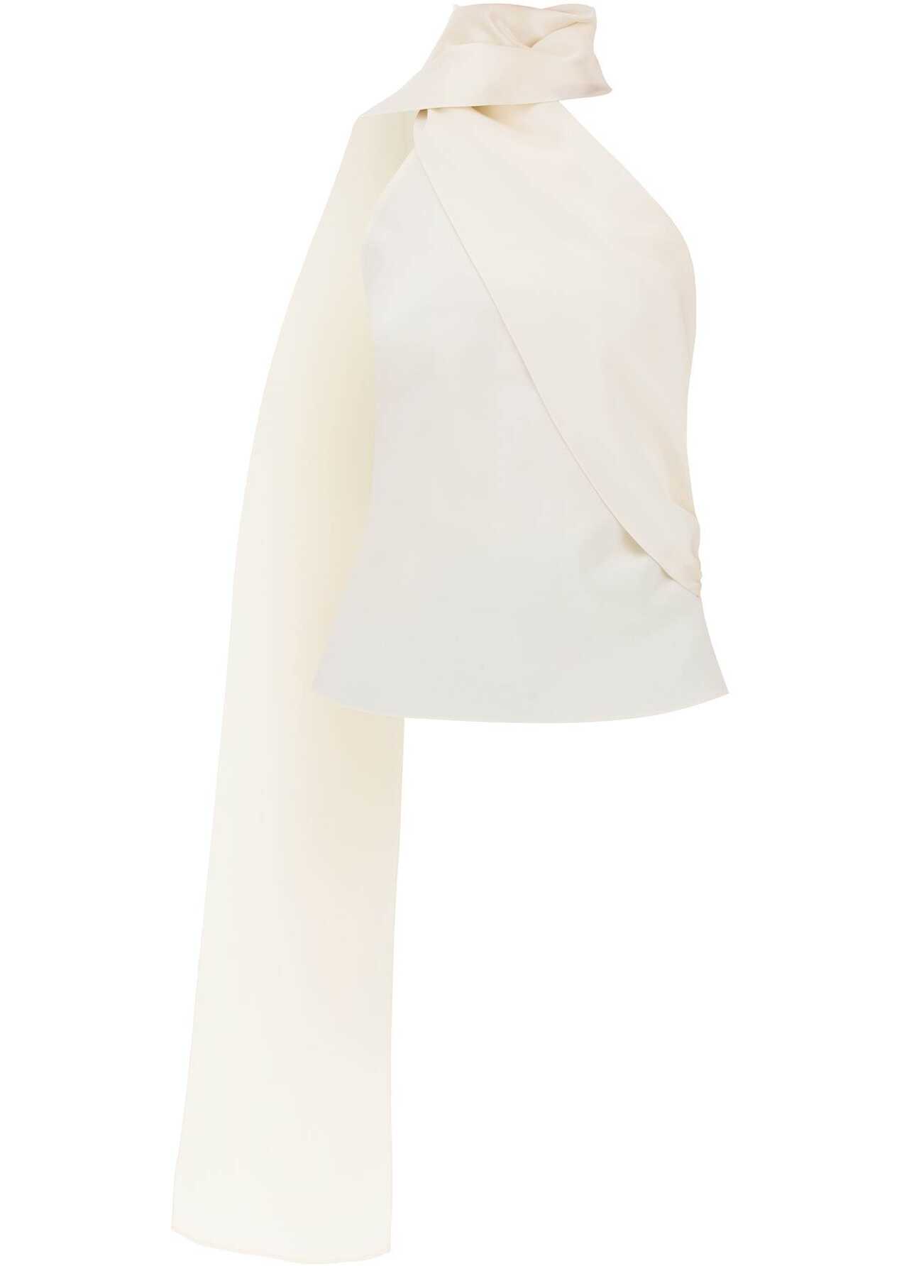 Crafted of pure silk satin, this top from Magda Butrym features a long draped sash that wraps around the neck. A loop-and-button fastening at the right side completes the design. The model is 177 cm tall.