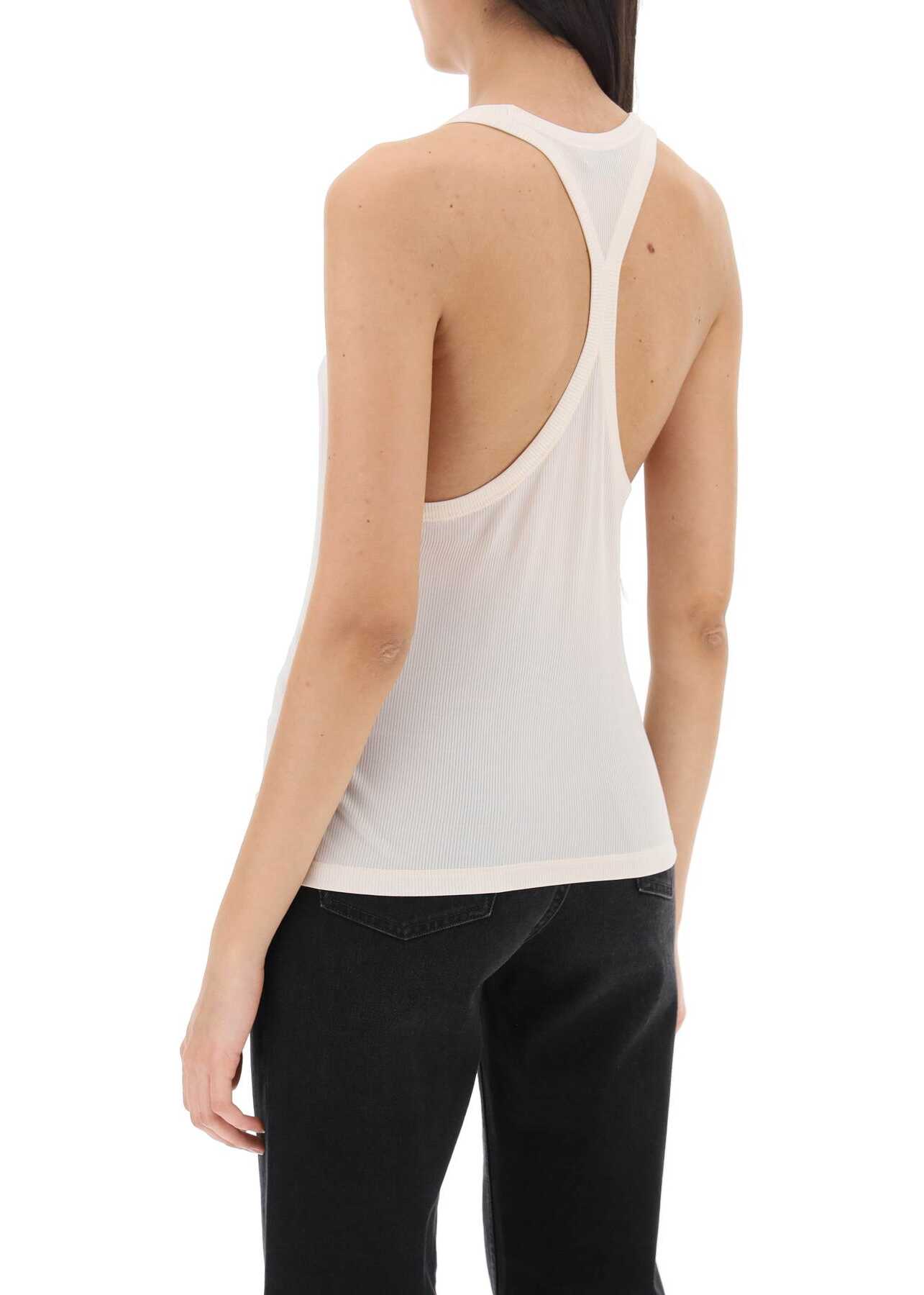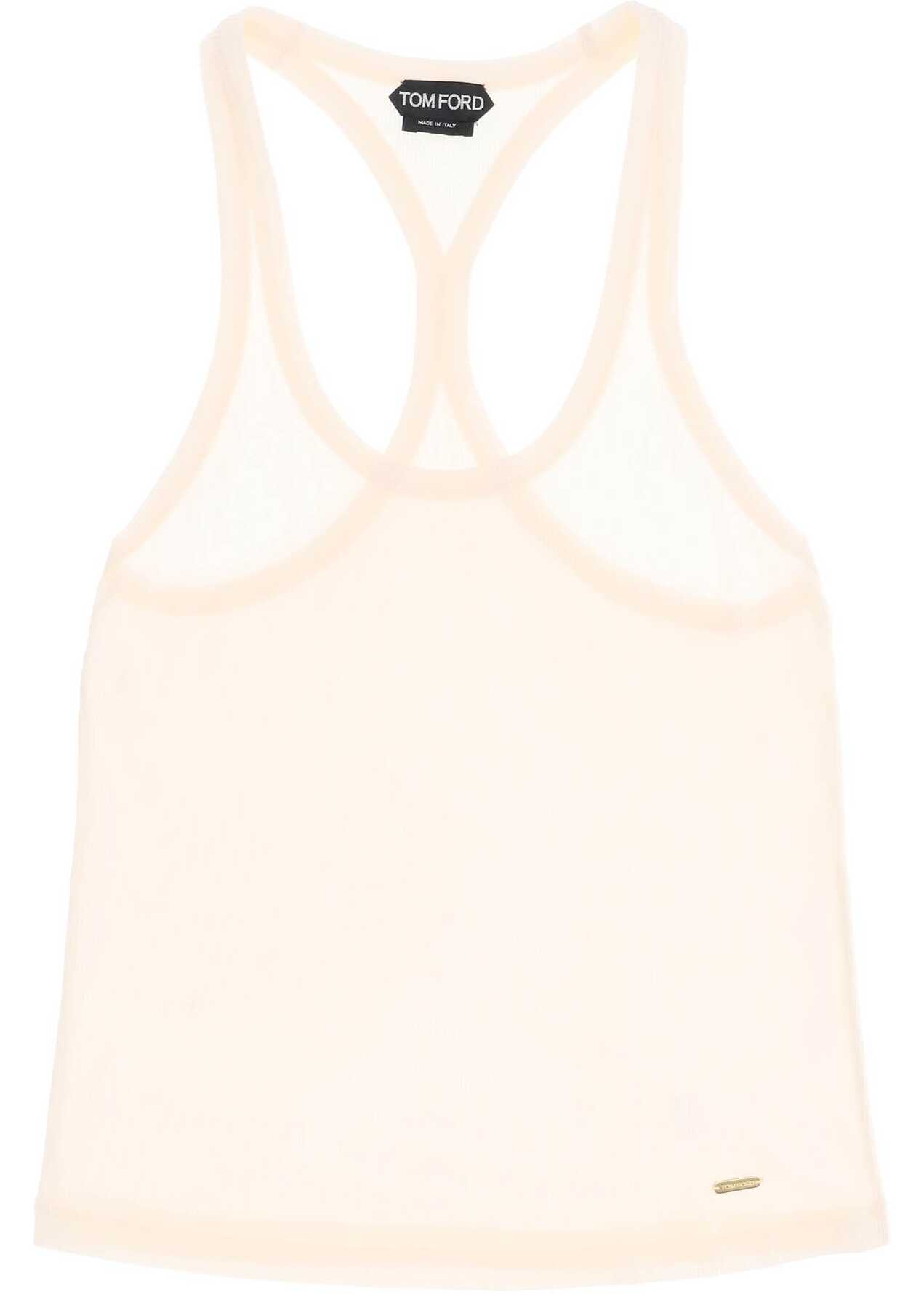 Tom Ford racerback tank top crafted in shiny-finish ribbed viscose jersey, with scoop neck and metal logo plaque on the hem. Fitted. The model is 177 cm tall and wears size IT 38.