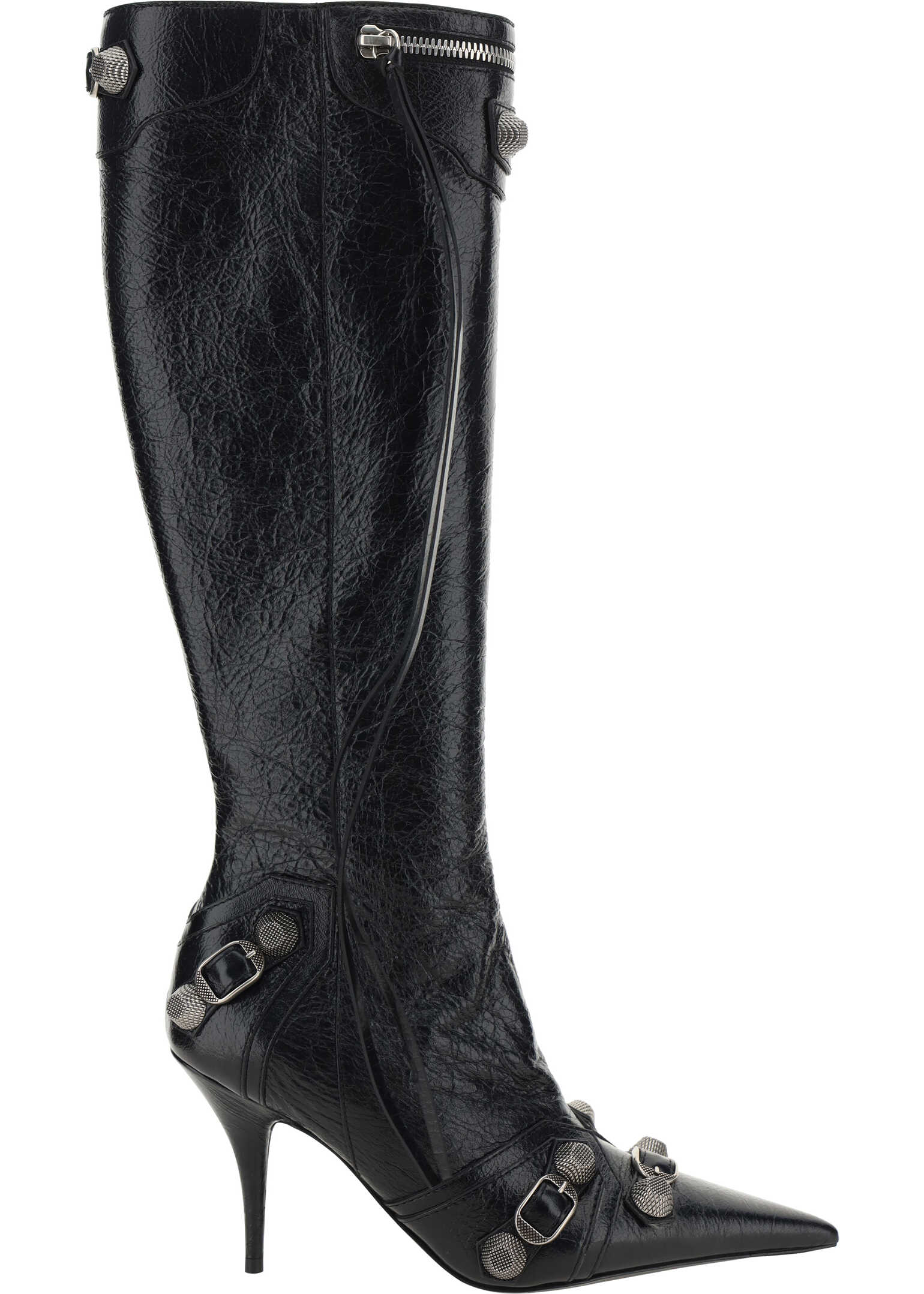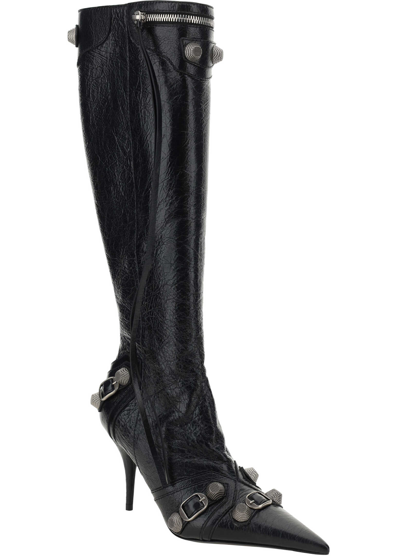Lambskin Cagole Boots by Balenciaga, elongated toe, leather stiletto heel, zipper closure on inner side panel, antique silver stud trim, decorative buckle detail at back and heel, leather tassel zipper at front around calf.