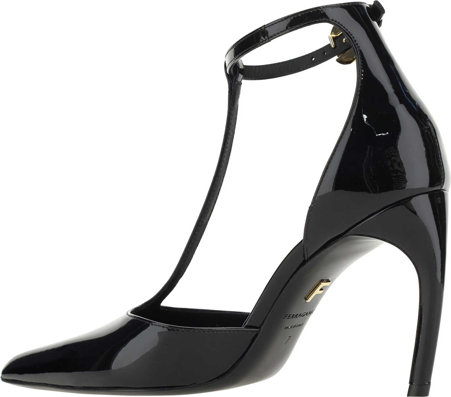 Calfskin Detailed Pumps by Ferragamo, patent leather design, geometric curved leather heel, jewel-embellished ankle lap strap for closure, elongated front toe.