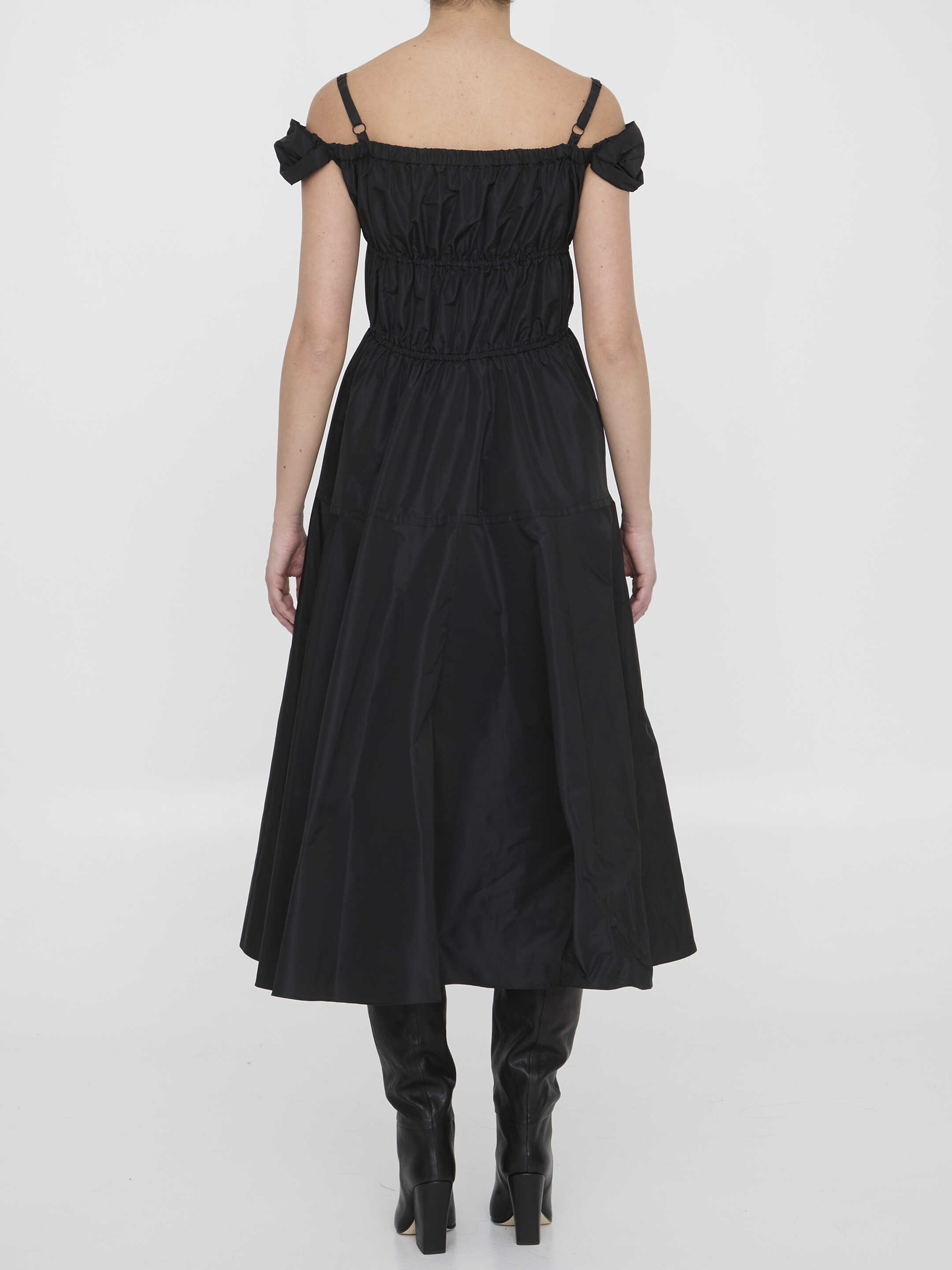 Cocktail maxi dress in black recycled polyester faille. It features elasticated neckline with lingerie-style straps and off-the-shoulder sleeves, maxi bow on the front and two side welt pockets. Flounced design. Regular fit.