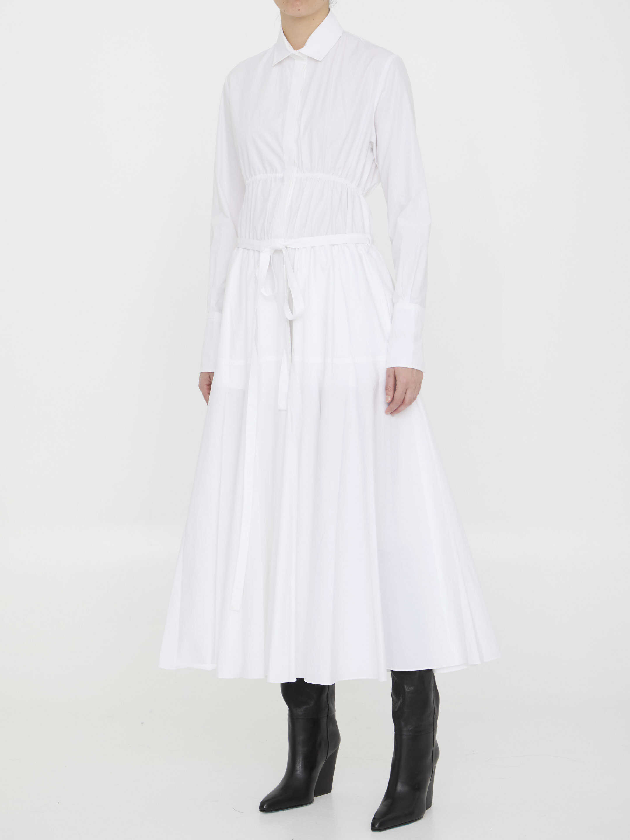Shirt dress in white cotton. It features classic collar, front button closure, elasticated waist, laces at waist and buttoned cuffs. Flounced design. Regular fit.